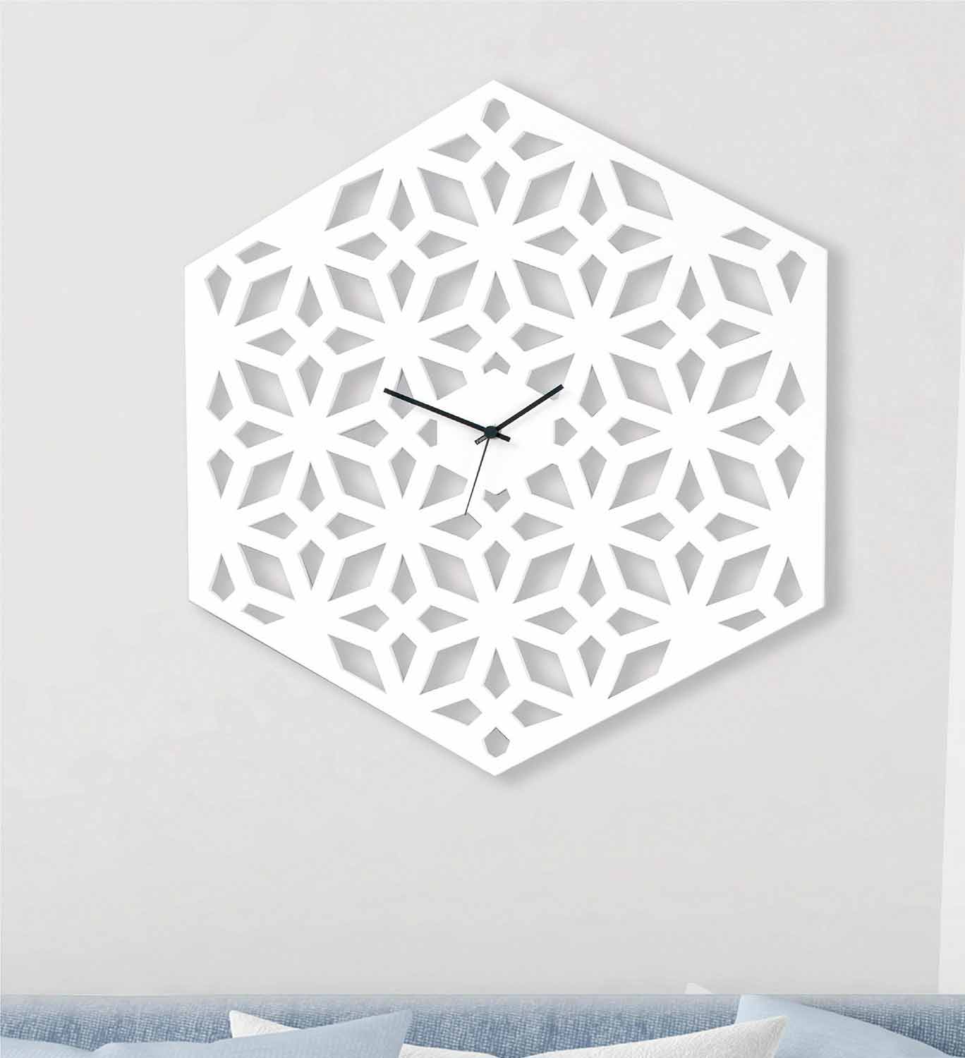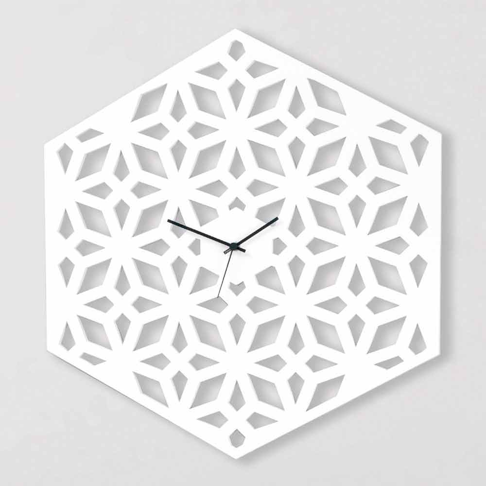 Large hexagonal wall clock of modern design in colored wood made in Italy.