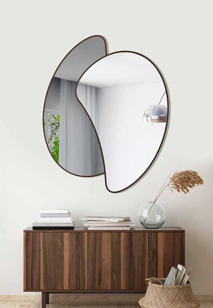 This minimalist wall mirror is made up of two mirrors, one of which is a smoky color, with elegant lines and modern shapes combined with refined lacquered finishes for a result with a minimal and decorative aesthetic impact, in a unique style.