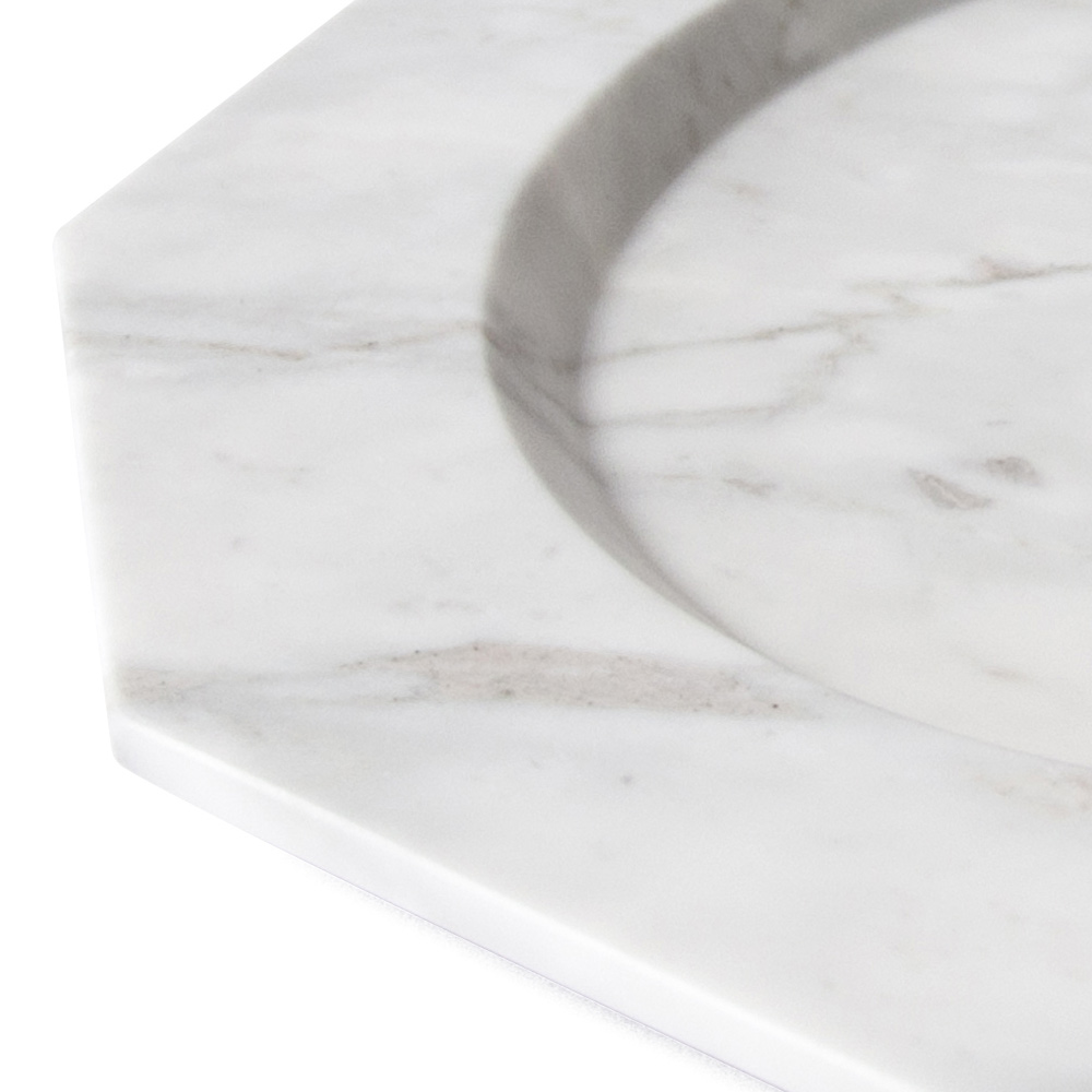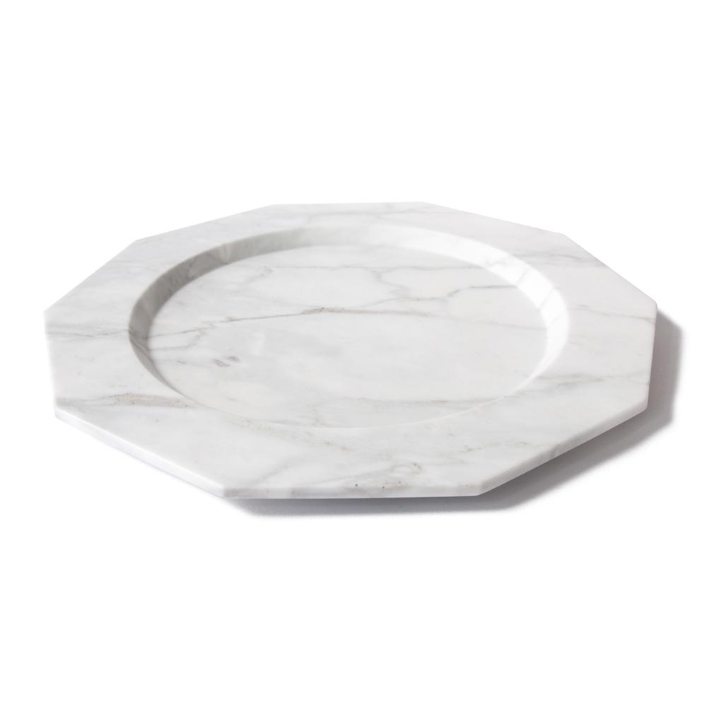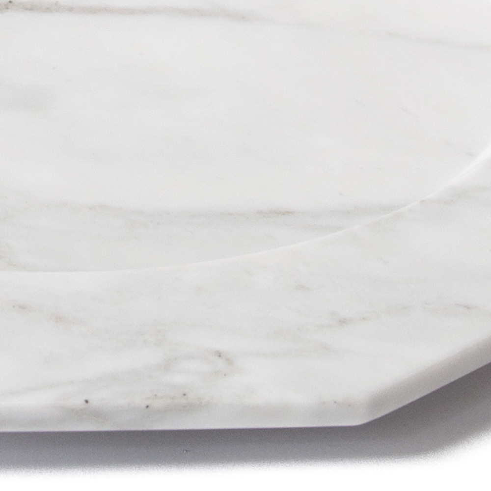 This flat serving plate is characterized by its decagon shape and the elegance it releases and which it gives both on the table and as a decorative object. A sophisticated and refined design capable of becoming the protagonist in the destination environment thanks to its essentiality emphasized by the satin-finished Arabescato Carrara marble with which it is made.