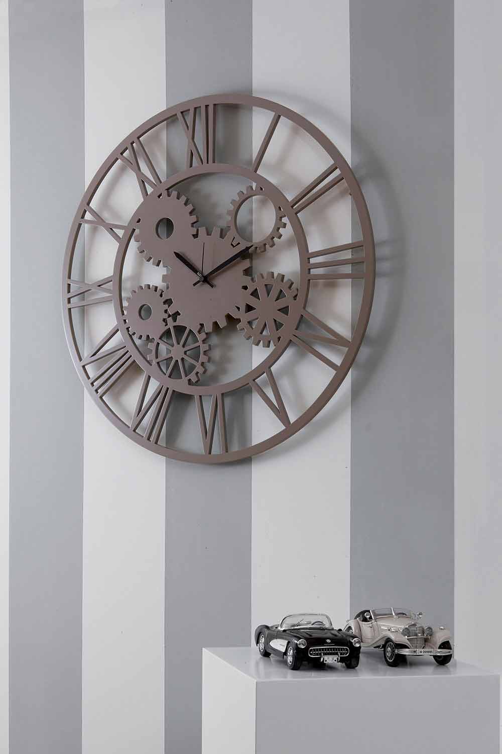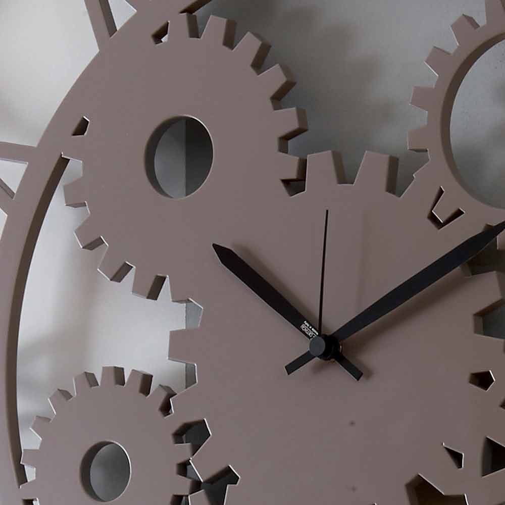 Round clock of large dimensions and of great impact thanks to the colors and details of which it is made, entirely in laser-cut wood with decoration of gears in the center.