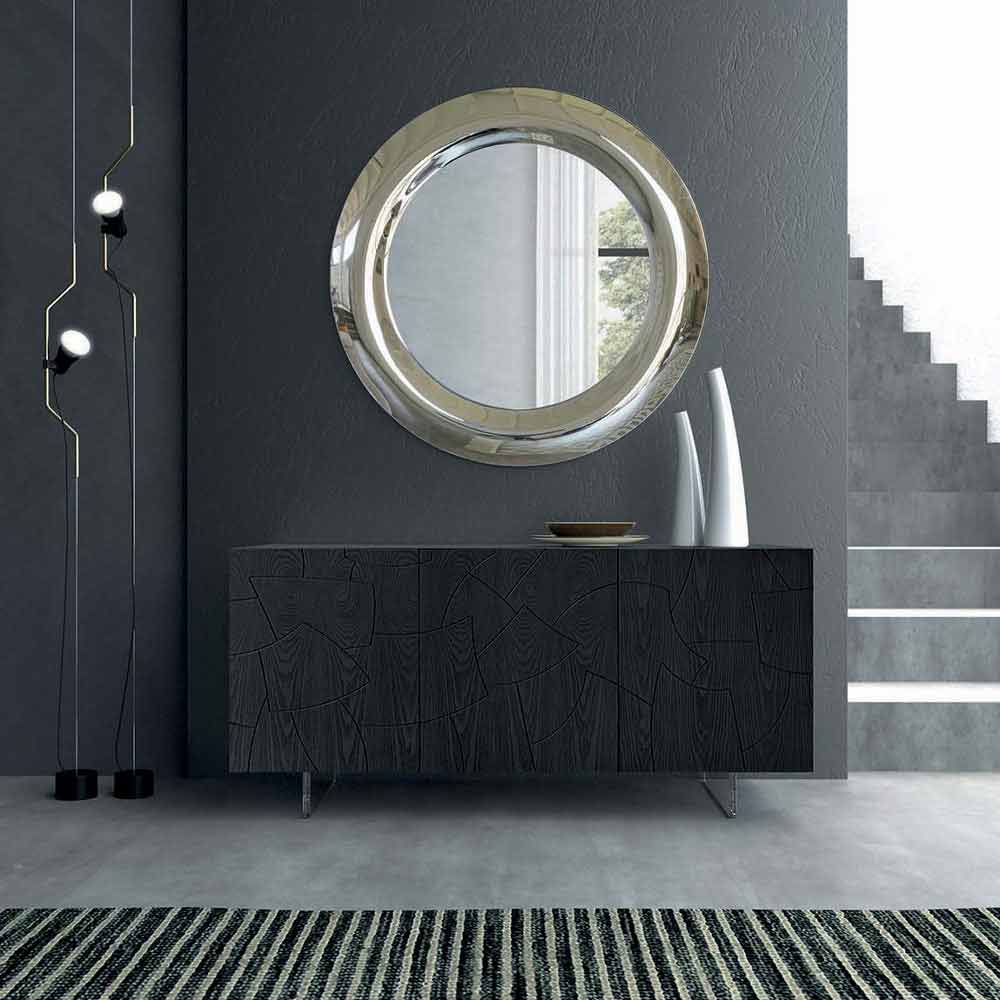 Wall mirrormade in Italy with internal mirror Ā in glass with mirrored crystal finish and convex frame also in mirrored crystal finish. The use of simple and essential lines combined with extremely elegant finishes gives life to a minimal piece of furniture that does not go unnoticed thanks to its imposing size and the use of the round shape that gives movement and harmony to the interior. environment.