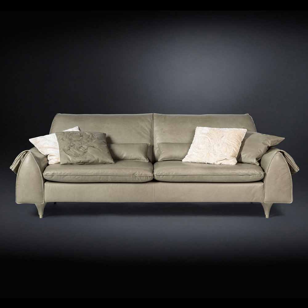 The elegant sofa Eve has handcrafted Aniline leather cover in the taupe colour. The arms of the sofa include handles and storage.