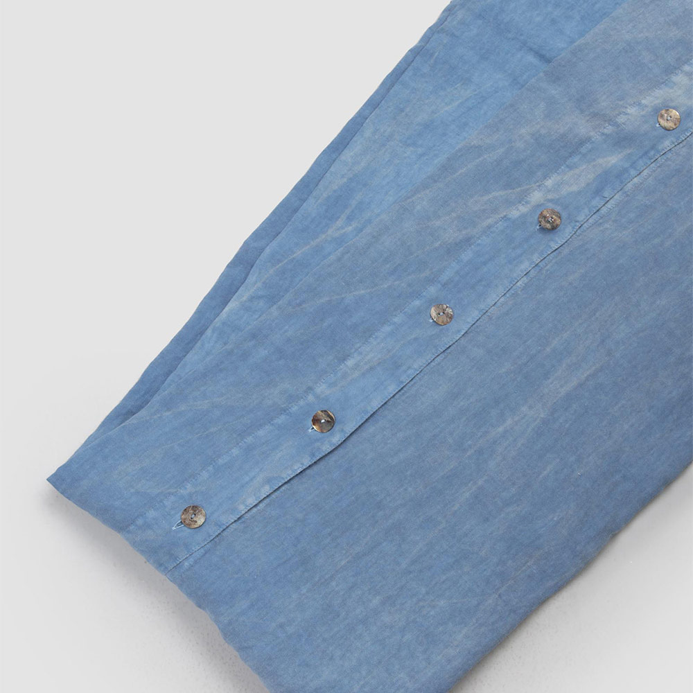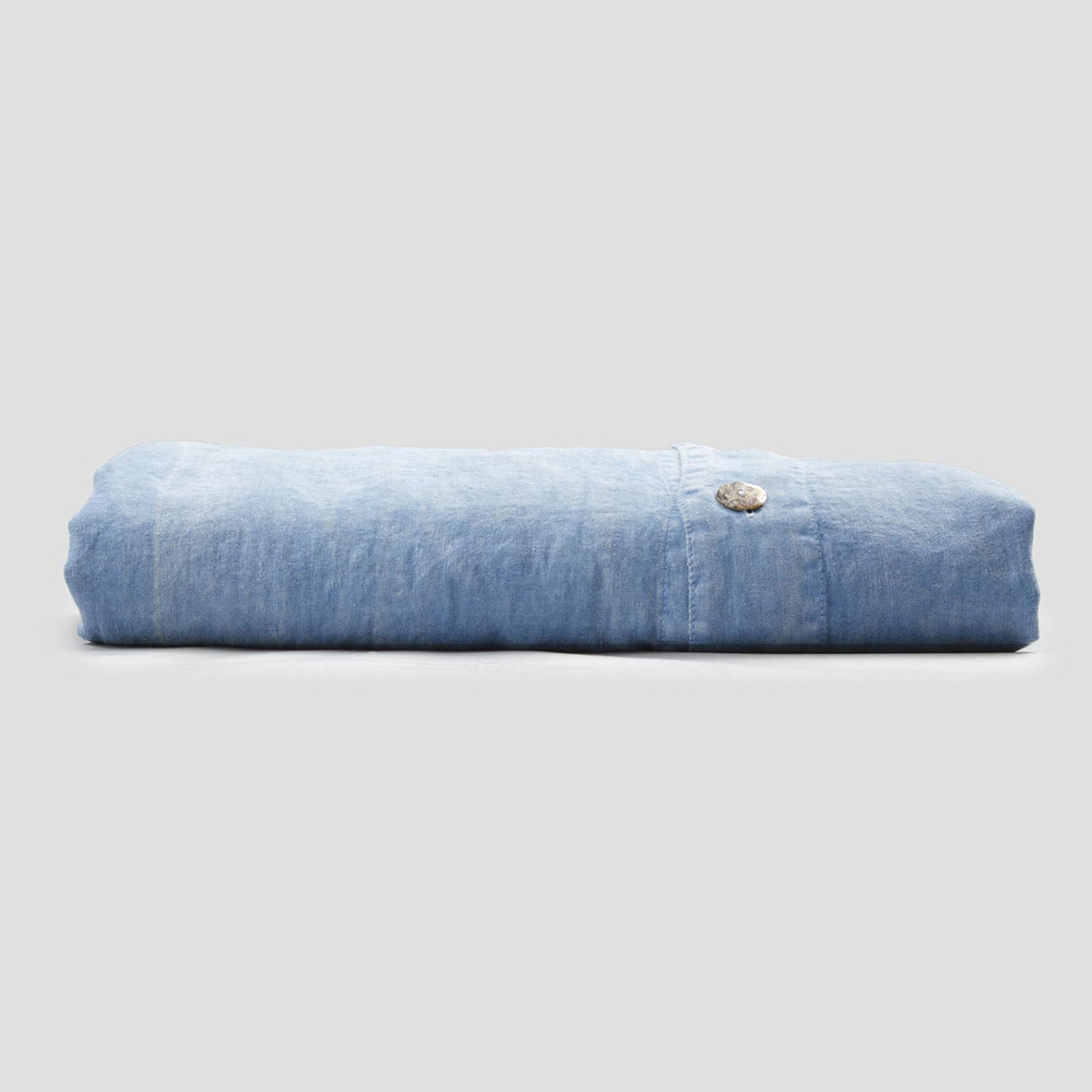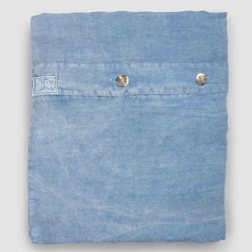 Double duvet cover with buttons and flap in light blue linen, handcrafted luxury design made in Italy.