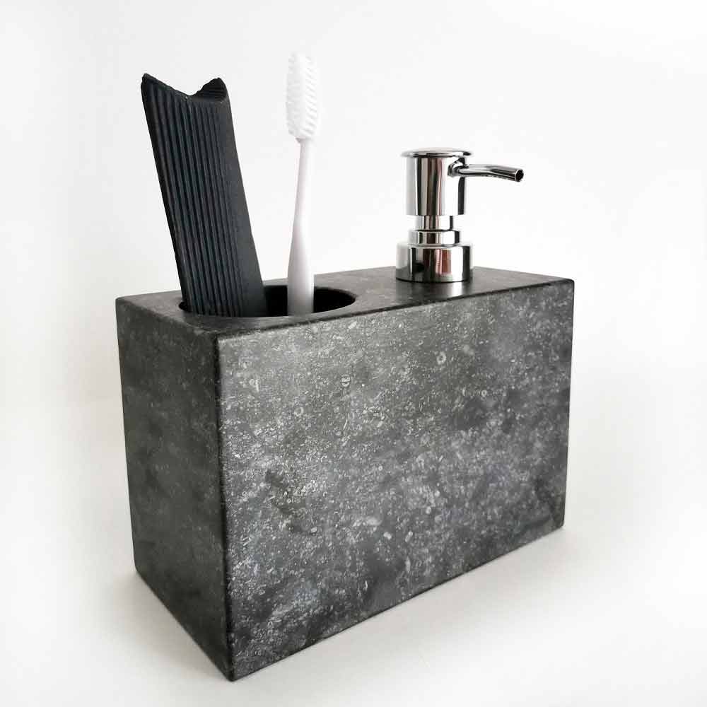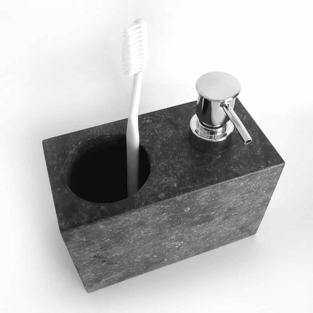 Dispensers for liquid soap with hole for toothbrushes and toothpaste made by hand in black marble with veining in shades of gray in polished finish obtained by by craftsmen specific processes that treat the product in detail and provide even more quality. Its geometric design and simple lines make the product the ideal choice to complete the furnishing of bathrooms with a minimalist and modern taste, combining the decorative aspect with the functional one.