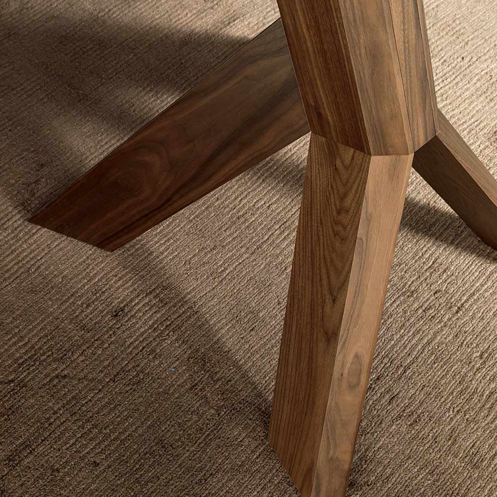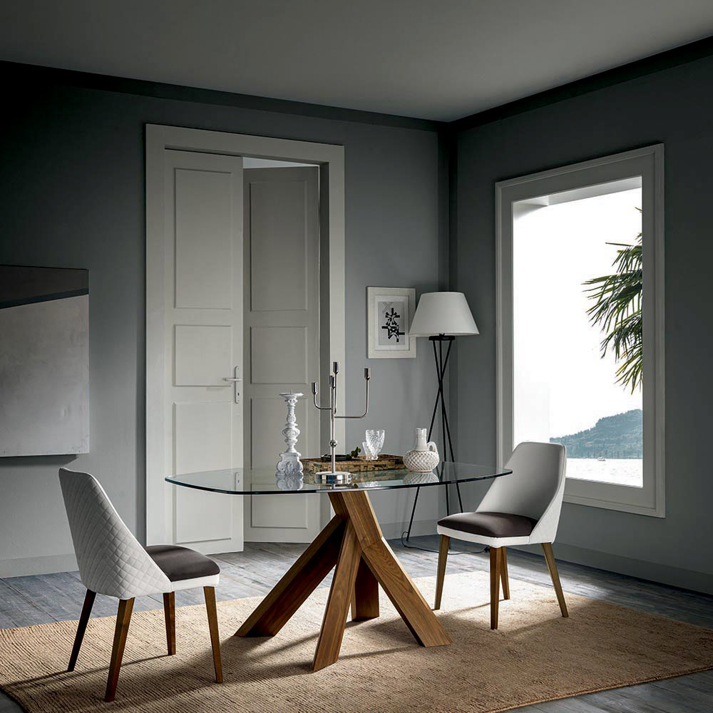 This dining table has a structure with 4 legs in veneered wood with a canaletto walnut finish Ā and a transparent tempered glass shaped barrel. Its peculiarity is given by the structure which, inspired by nature , recalls the shape of the roots of an oak intent on supporting the ethereal and shining glass of the top with great strength.