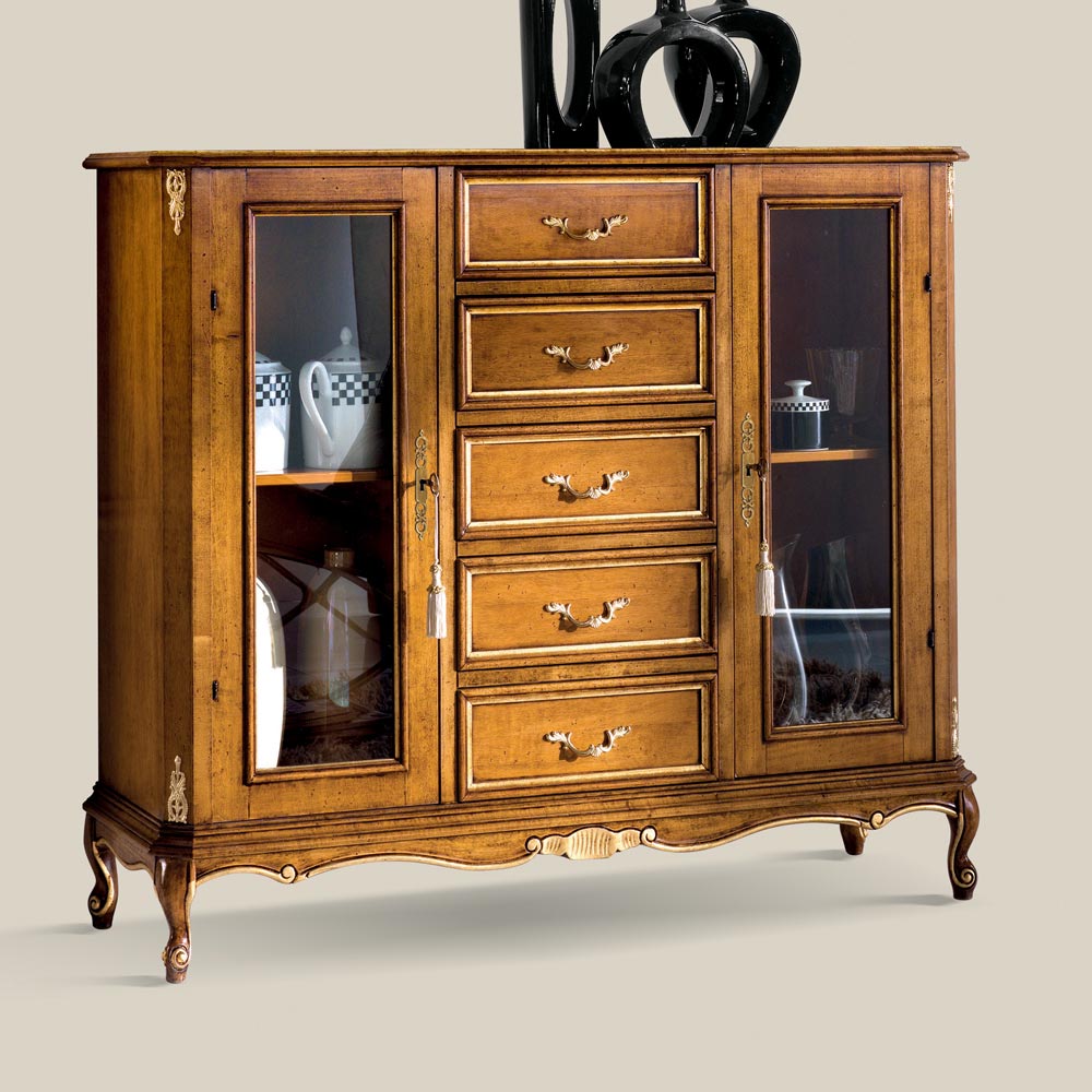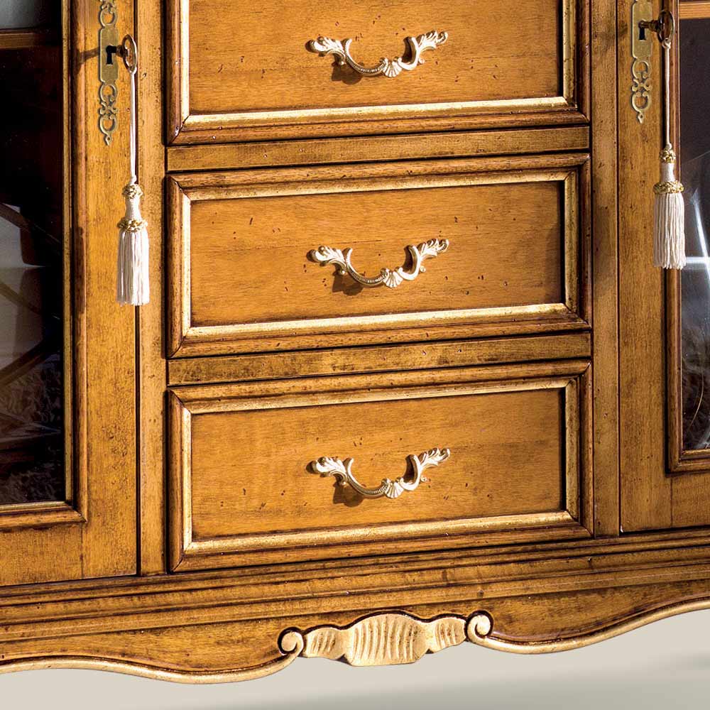 Classic style living room display cabinet made of precious Bassano walnut and antique gold finish wood , with 2 glass doors and 5 drawers. Elegant and timeless, this classic style display cabinet is ideal for creating impressive settings. Completely made in Italy and handcrafted by skilled master craftsmen , finished with wisdom and taste for elegance. The production is carried out using fine materials , and performing the workbyhand with the utmost care and professionalism that distinguishes Made in Italy products.