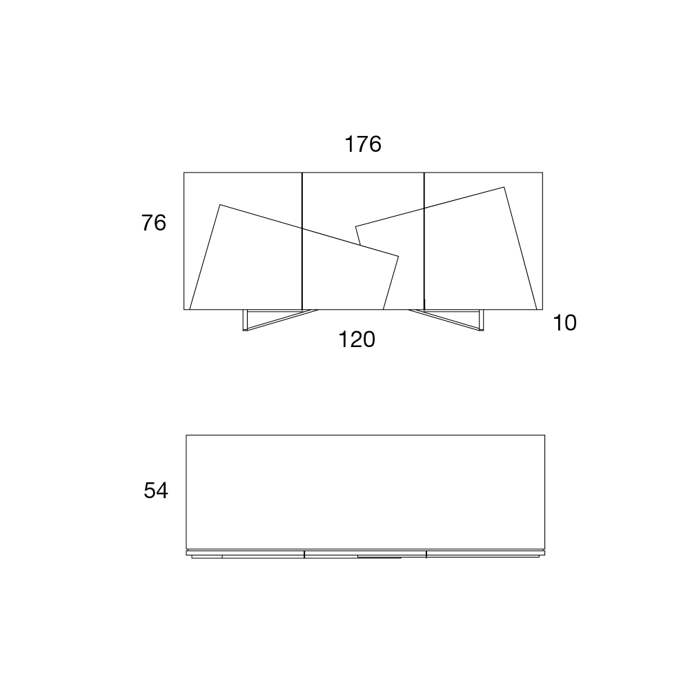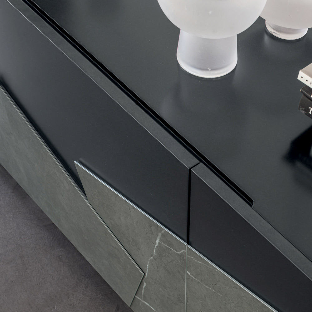 This sideboard for the living room has a design made entirely of lacquered mdf in metallic anthracite finish with 3 doors and 3 internal shelves in transparent tempered glass. The peculiarity of the complement is given by the matt ceramic inserts on the doors available in various finishes. The design thus creates a lively play of shapes for a refined and lively result, suitable for the most refined and elegant living rooms or more informal environments.