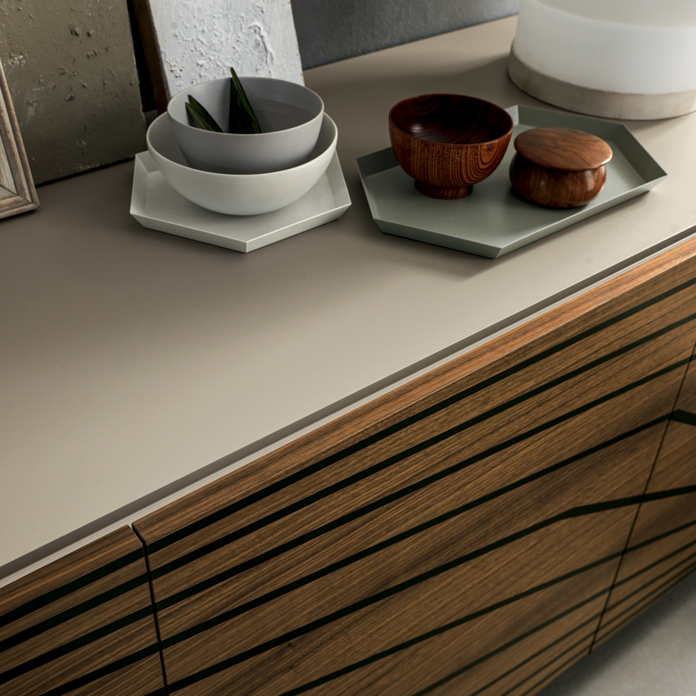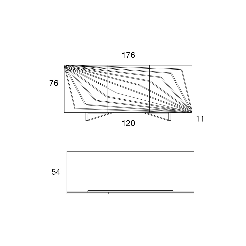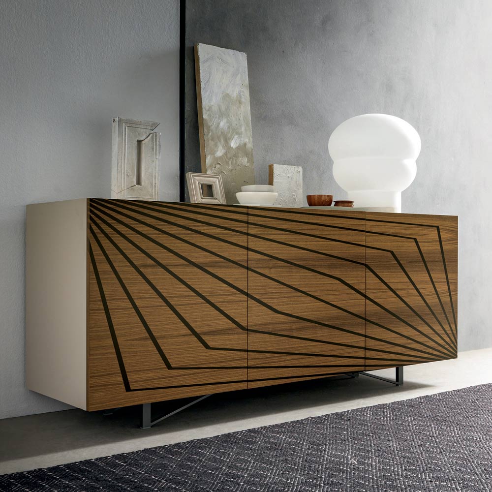 This sideboard for the living room has a structure made entirely of lacquered mdf with 3 veneered doors with screen-printed inlays and 3 internal shelves in transparent tempered glass. The peculiarity of the furnishing accessory is given by the lines that converge in the external points forming an exclusive optical effect , for a design that looks like a strongly characterizing abstract painting.