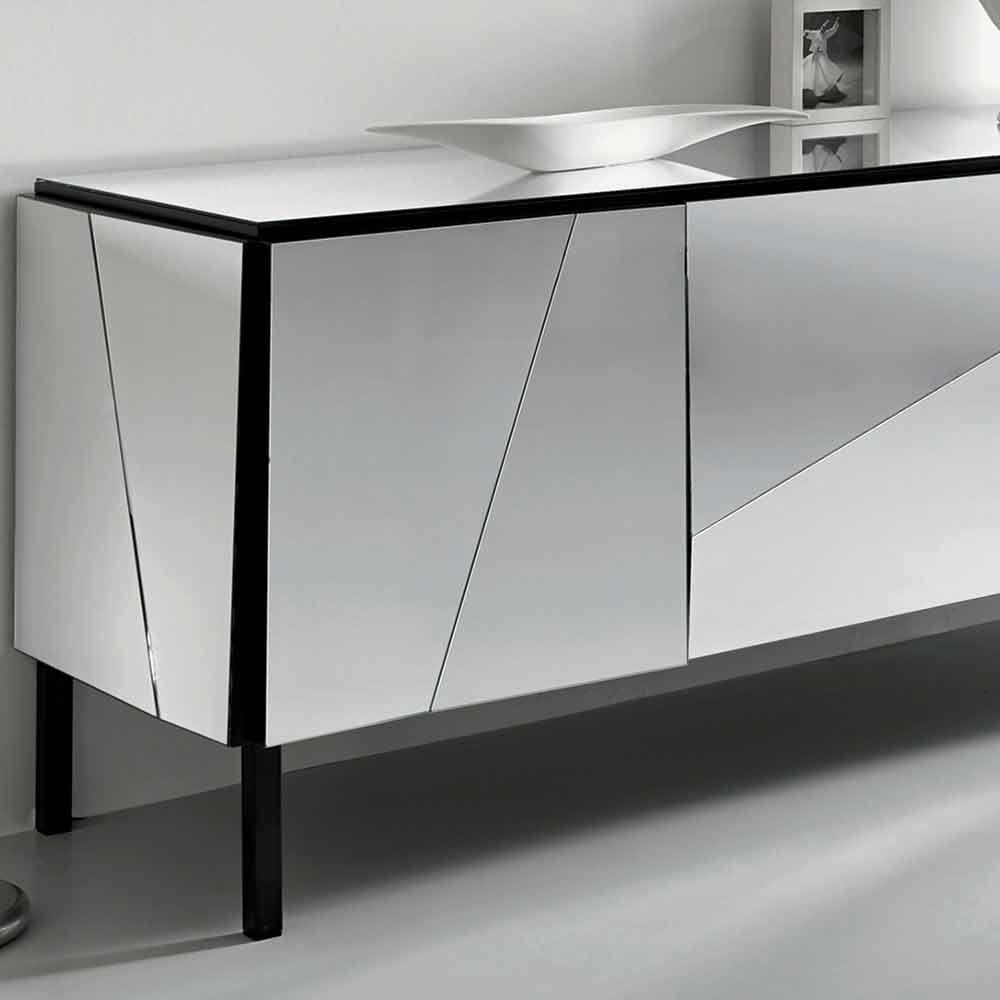 Made with a structure and feet in matt black lacquered wood, the mirror effect is total thanks to the glass cladding with concave and convex mirrors that makes it elegant and sophisticated, giving a touch of mastery and hospitality to the environment.