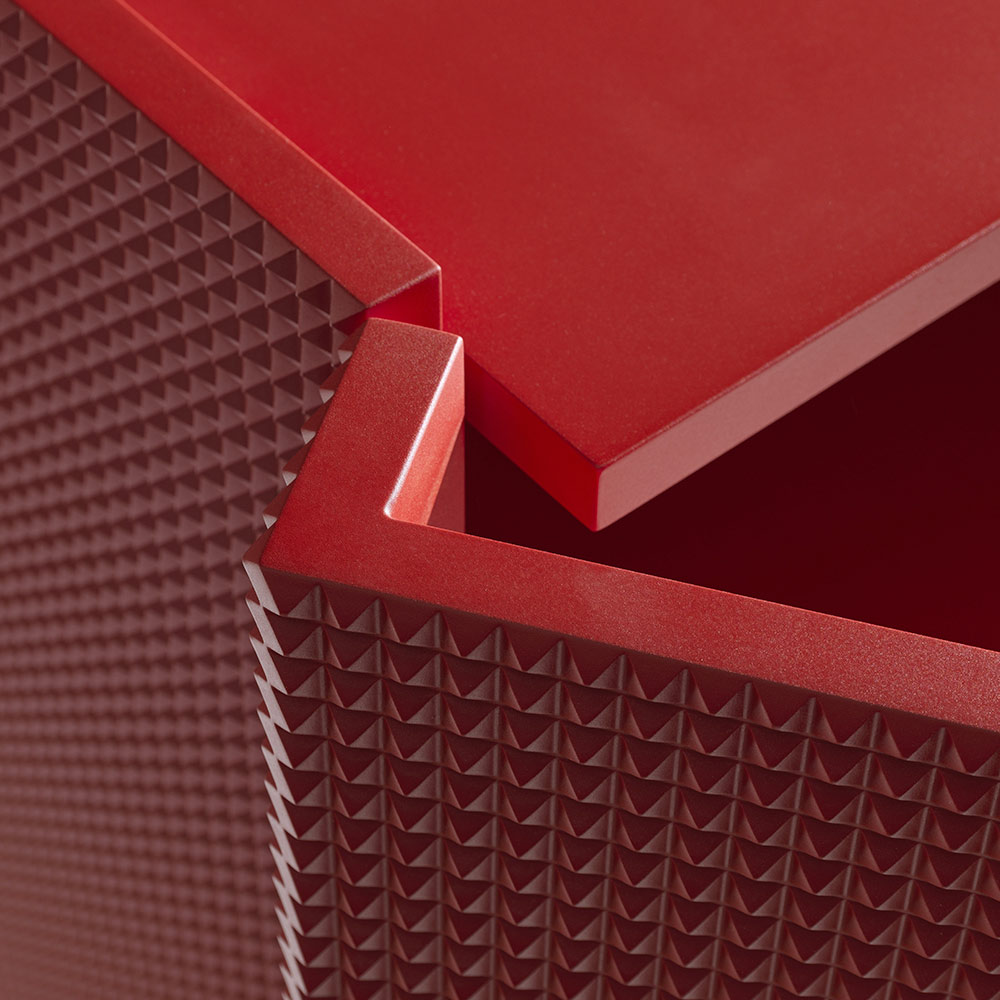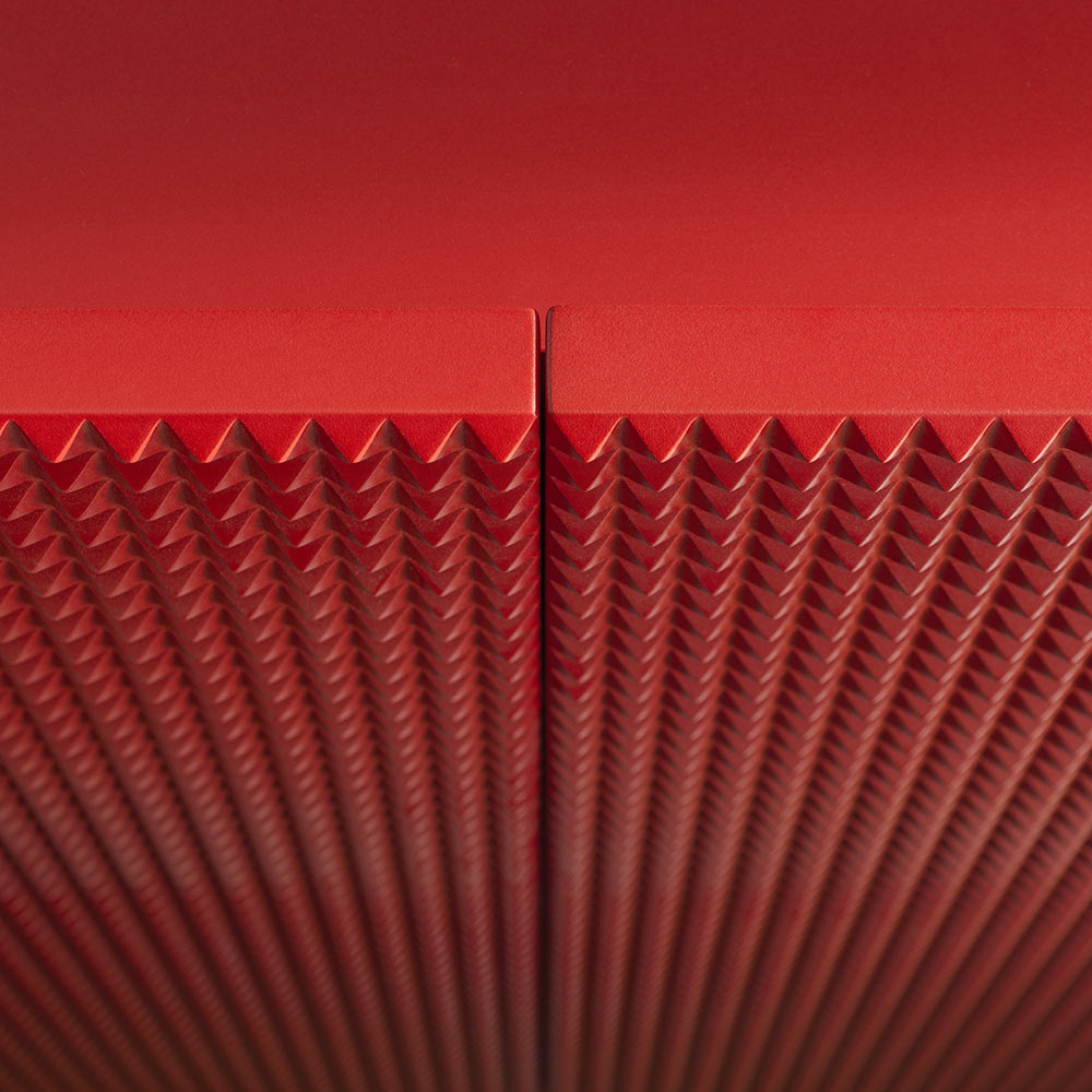 A sculptural piece that combines materiality and refinement , in perfect balance between aesthetics and functionality . This two-door sideboard stands out for its iconic orange/red “diamond” finish , a visually striking three-dimensional design, hand-sanded before the final lacquering to achieve a vibrant and extremely sophisticated surface.