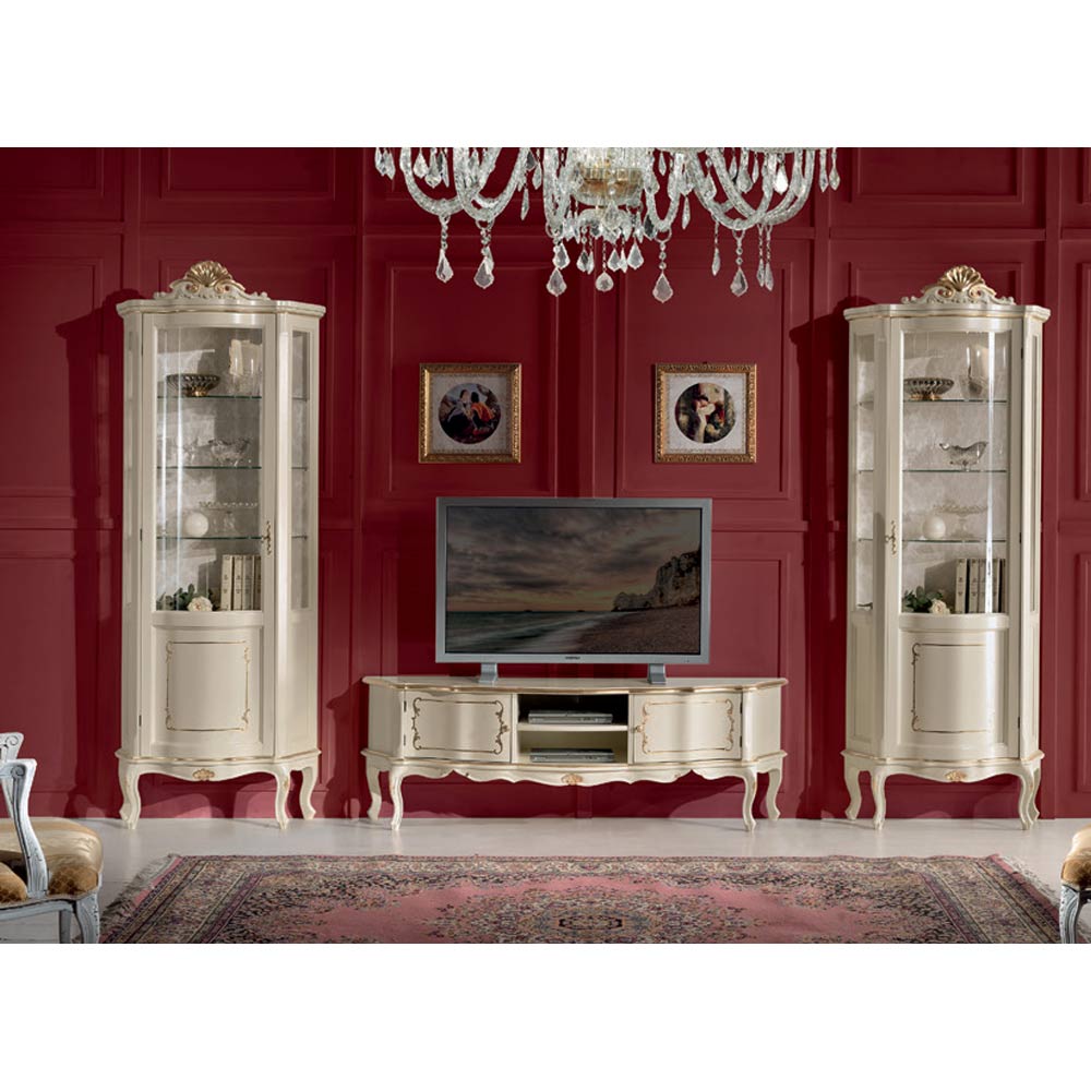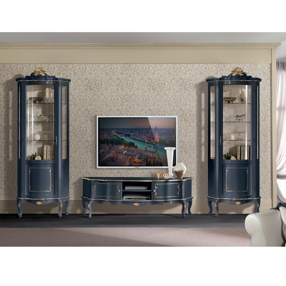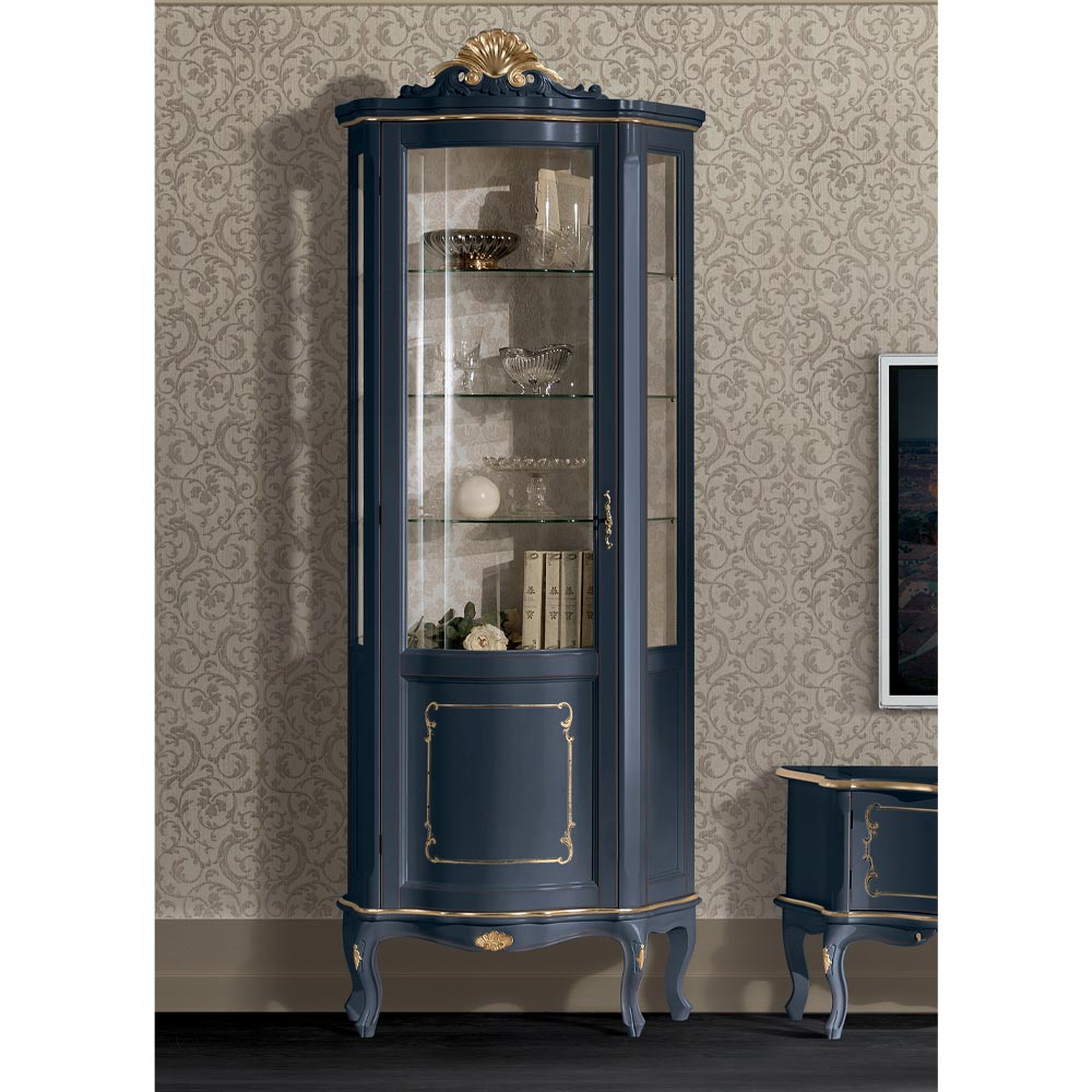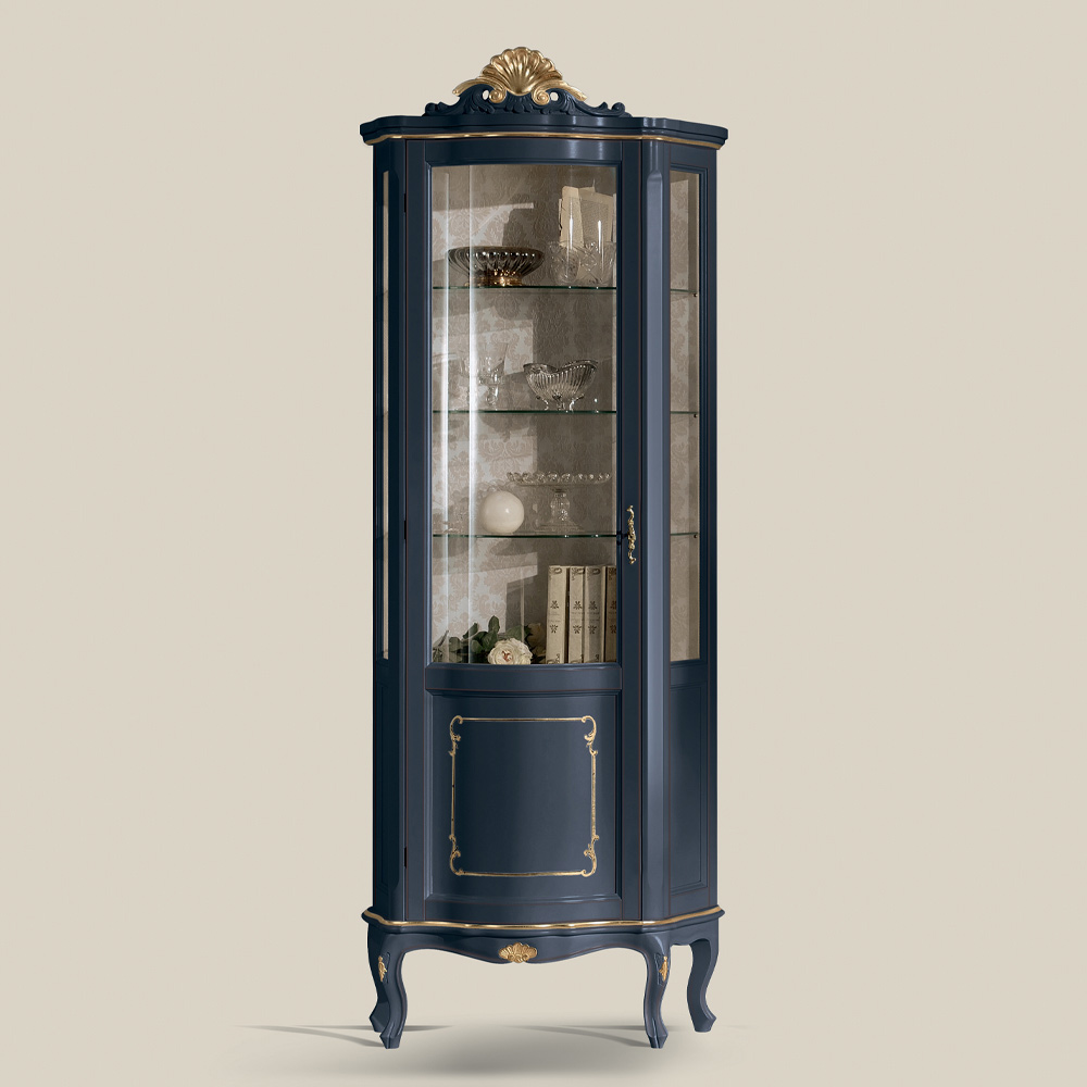 Living room display cabinet made of air force blue or white and gold finish wood with door, perfect for decorating any living area with taste and elegance . Available in the version with door that can be opened to the right or to the left. A unique and refined complement, completely made in Italy by skilled master craftsmen , masters of art who finish each complement with wisdom and taste for elegance. The production is carried out using fine materials , and performing the workbyhand with the utmost care and professionalism that distinguishes Made in Italy products.