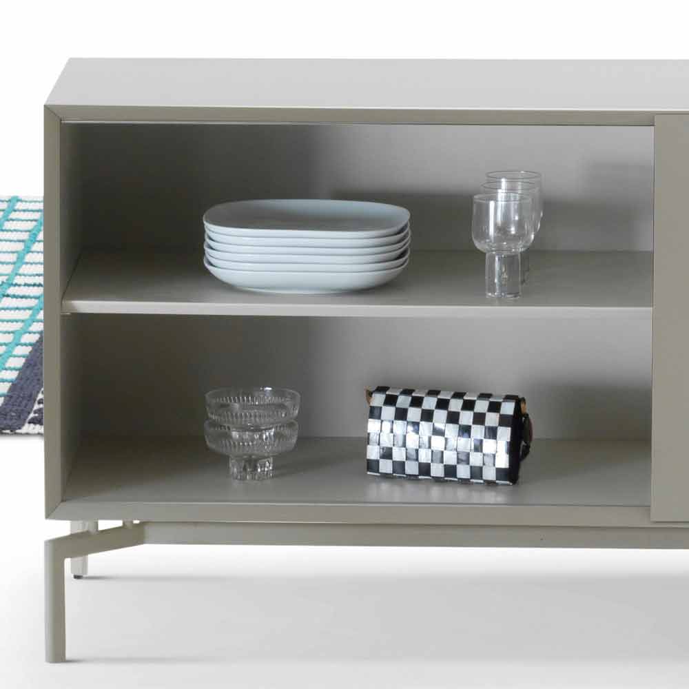 Sideboard in matte lacquered dove grey mdf, with grey warm lacquered open compartment.