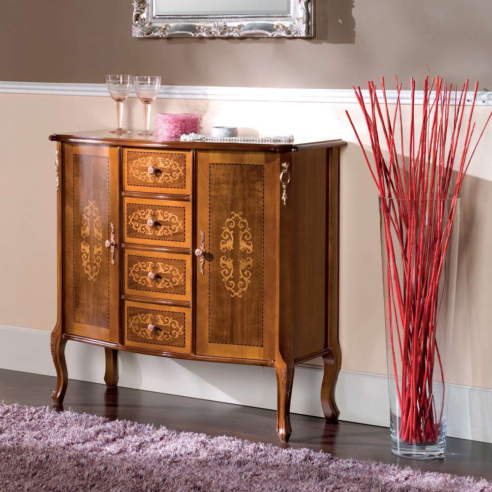 Classic styleliving room sideboard made of wood in glossy walnut finish with elegant gold inlays, complete with 2 doors and 4 practical drawers. A unique and refined piece of furniture, completely made in Italy by skilled master craftsmen , finished with wisdom and taste for elegance. The production is carried out using fine materials , and performing the workbyhand with the utmost care and professionalism that distinguishes Made in Italy products.