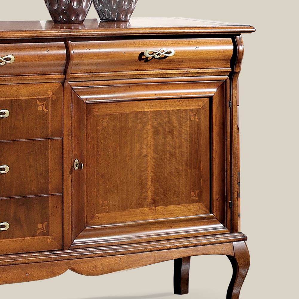 Classic styleliving room sideboard made of wood in walnut or white finishes. Elegant but at the same time practical as it has 2 doors and 6 drawers. Unique and refined, it is completely made in Italy by skilled master craftsmen , finished with wisdom and taste for elegance. The production is carried out using fine materials , and performing the workbyhand with the utmost care and professionalism that distinguishes Made in Italy products.