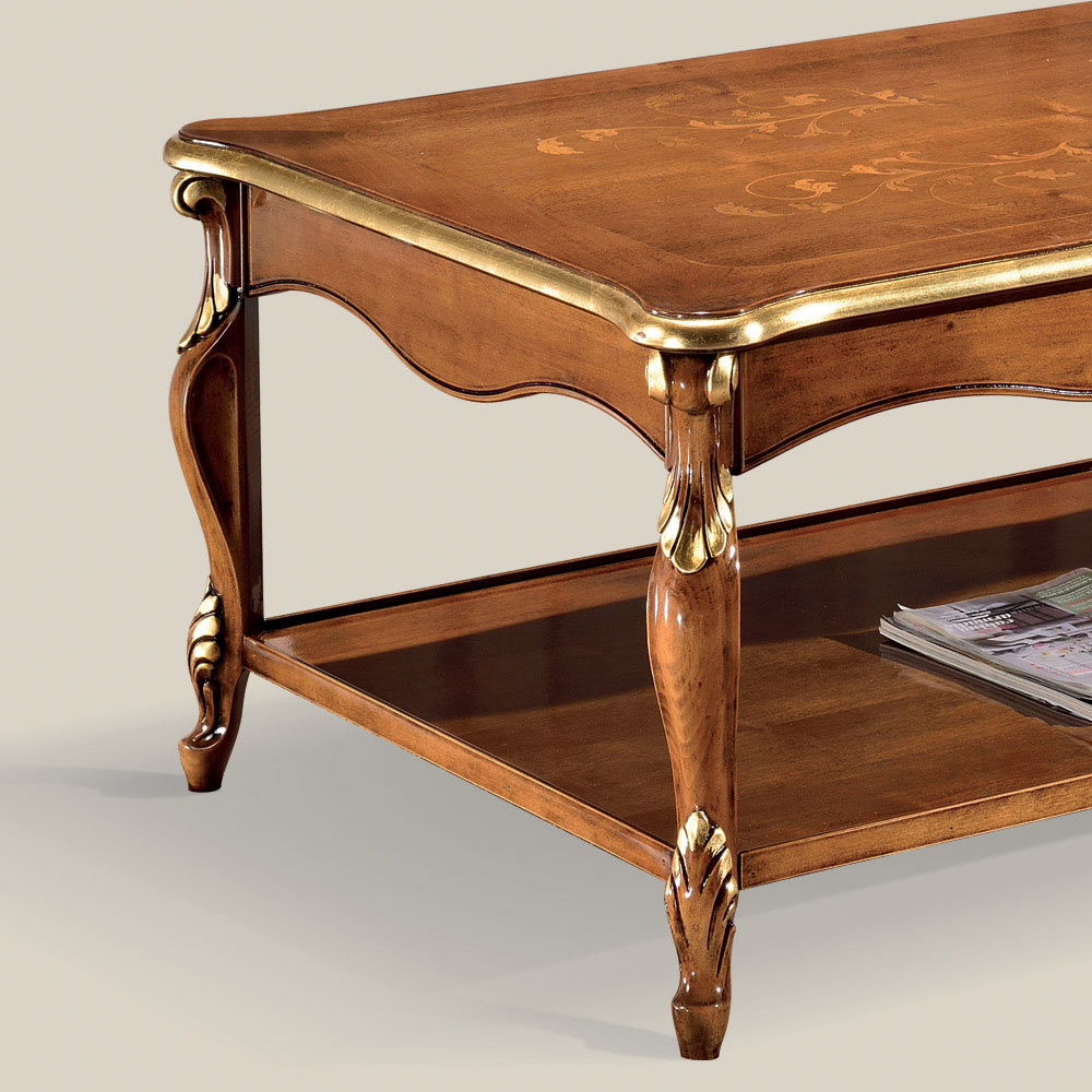 Rectangular coffee table made of Bassano walnut and antique gold, with inlaid top and practical shelf. A unique and refined complement, completely made in Italy by skilled master craftsmen , masters of art who finish each complement with wisdom and taste for elegance. The production is carried out using fine materials , and performing the workbyhand with the utmost care and professionalism that distinguishes Made in Italy products.
