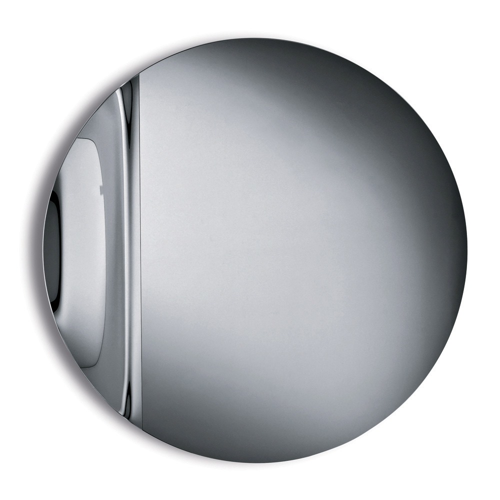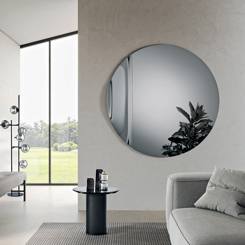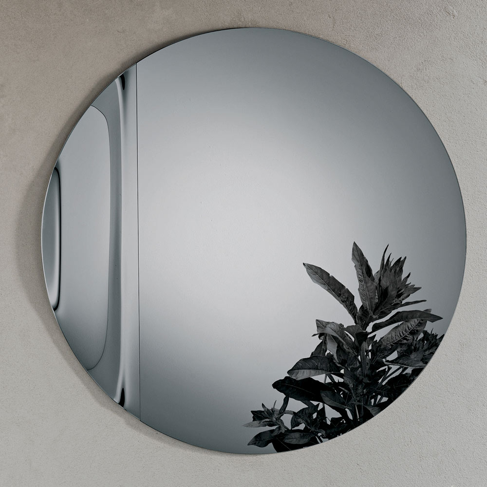The mirror features a round shape crafted from cast glass , embellished with a lateral wave that elegantly interrupts the perfect symmetry of the circle. This soft detail creates a refined play of reflections and gives the mirror a sculptural yet light appearance.