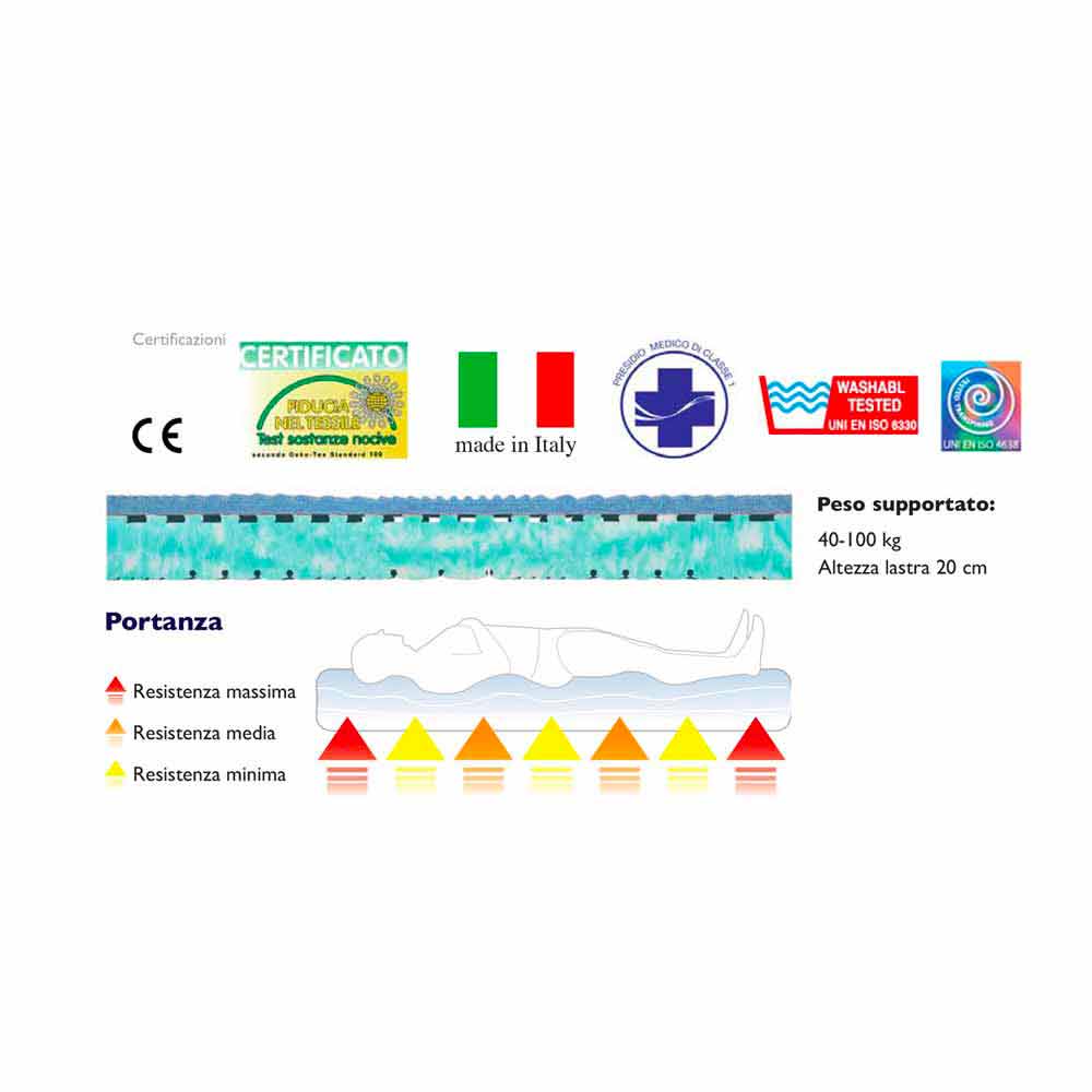For this reason we recommend the use of this mattress, certified as a Class I medical device, combined with a specially designed lining with integrated topper. Weight endured 60 / 120kg per person