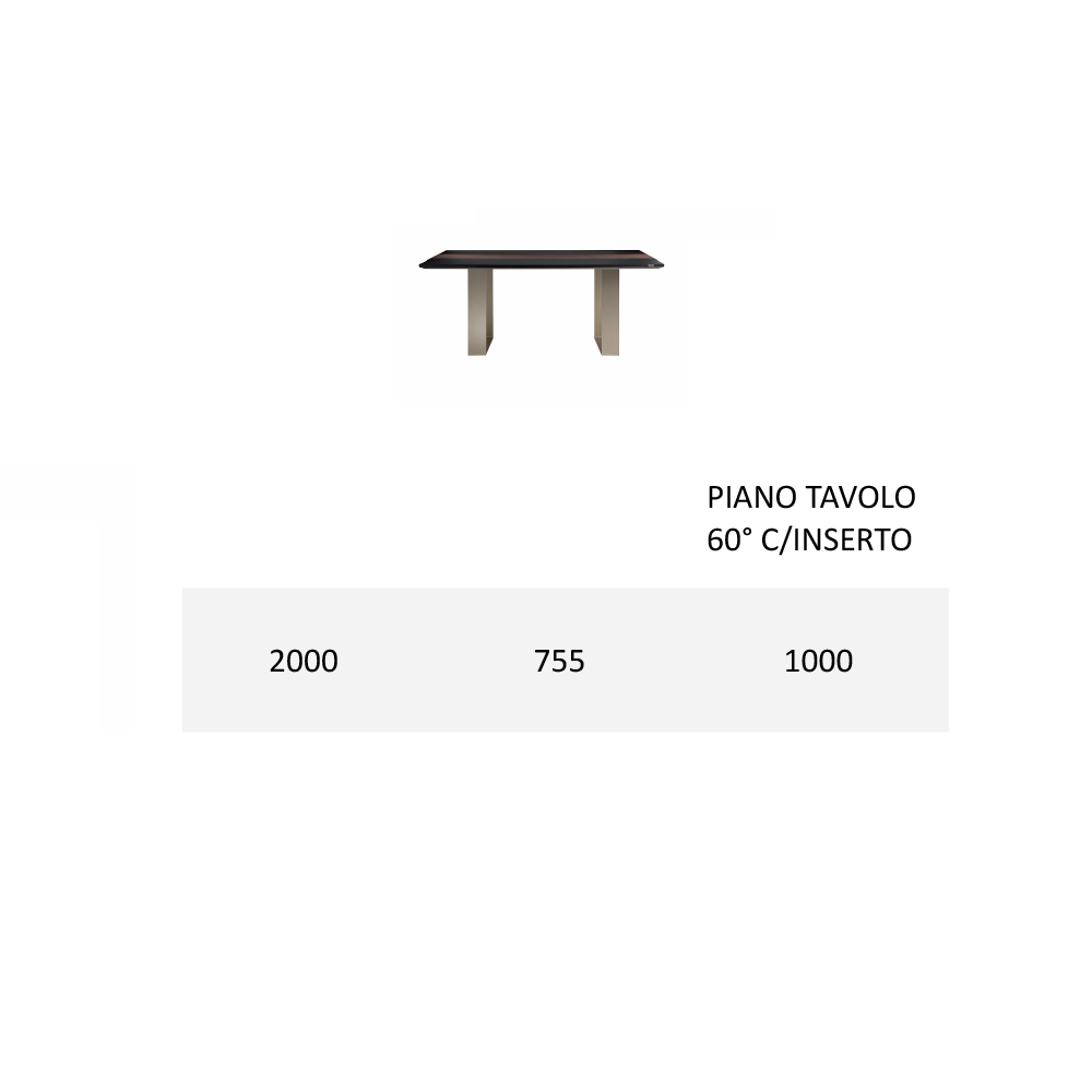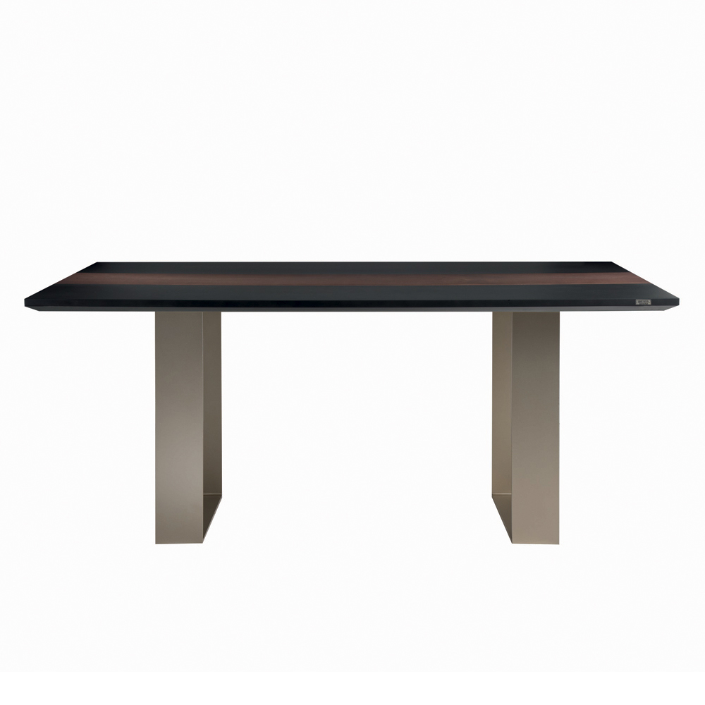 Dining table made in Italy consisting of two iron legs with nickel finish and rectangular top in mdf with charcoal finish with upper insert in solid wood with stained ash finish. A complement with a minimal but incredibly modern style, designed to furnish any living space in an essential way. Its aesthetic is particularly simple, marked by minimal shapes, a rectangular top resting on two legs with a particular workmanship that transmit a dynamic and elegant visual effect.