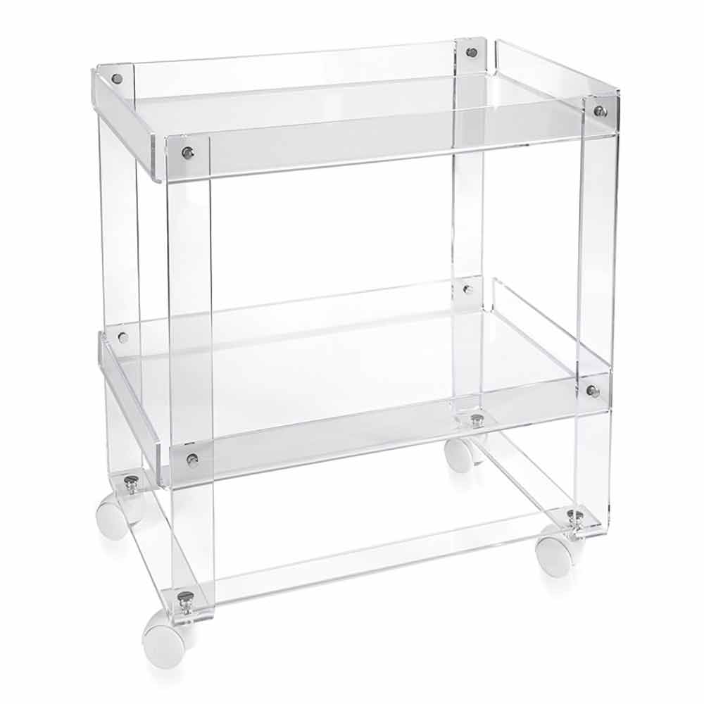 Practical and versatile food-trolley made with plexiglass 100% from virgin polymer, composed by 2 shelves making it very useful as auxiliary trolley in the domestic space.