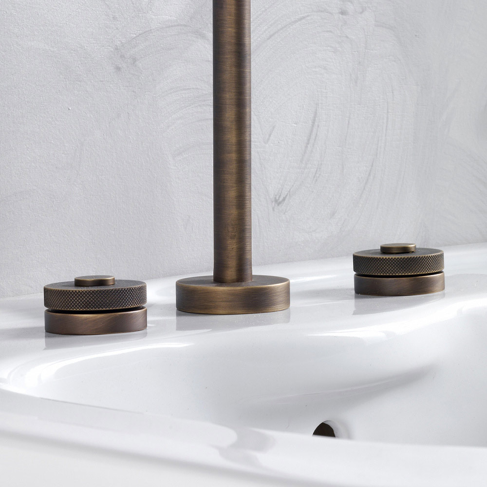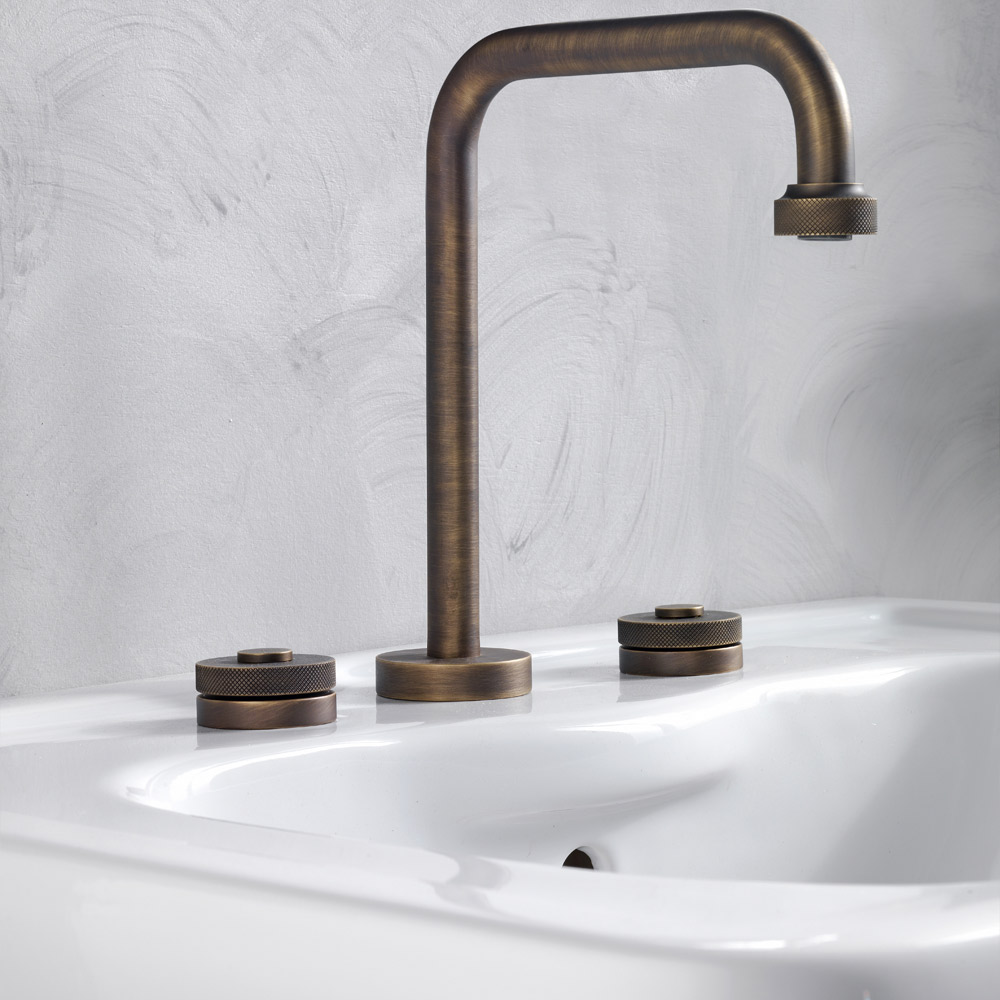 Battery 3-hole washbasin with drain entirely handcrafted by expert artisans in the industry in heavy brass, cast in molds that respect the craft systems of the past and protected with a thick layer of finish available in various colors.