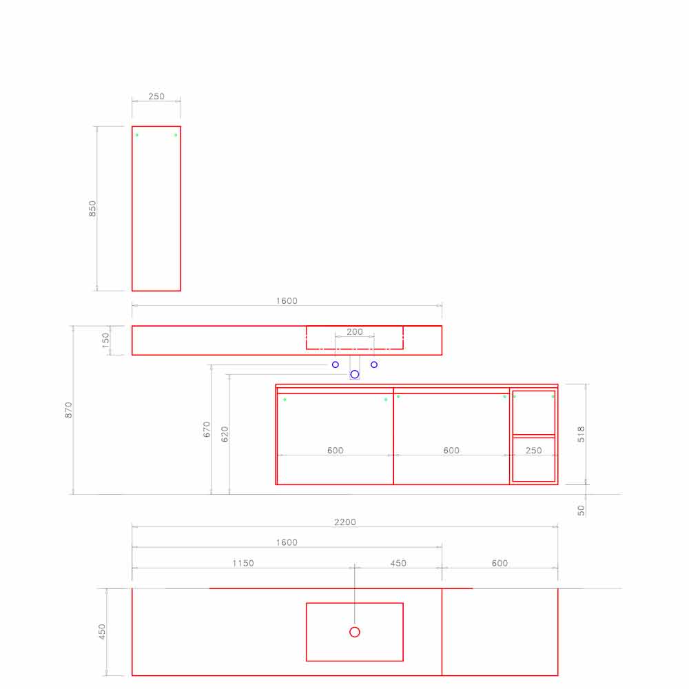 The composition includes: - box top with integrated washbasin in Teknorit h.15 without overflow hole, tap hole included, including free waste drain L.160 X D.45 X H.12 cm - integrated washbasin 60 cm, 60 x 30 h.11 cm - 2x washbasin unit 1 drawer + 1 internal drawer L.60 X P.45 X H.50 cm - side open base 1 shelf L.25 X P.45 X H.50 cm - 1 door wall unit, 2 Push and pull opening shelves L.25 X P.22 X H.85 cm - Top for side bases L.147 X P.45 X H.1,6 cm - Retractable brackets to support shelves