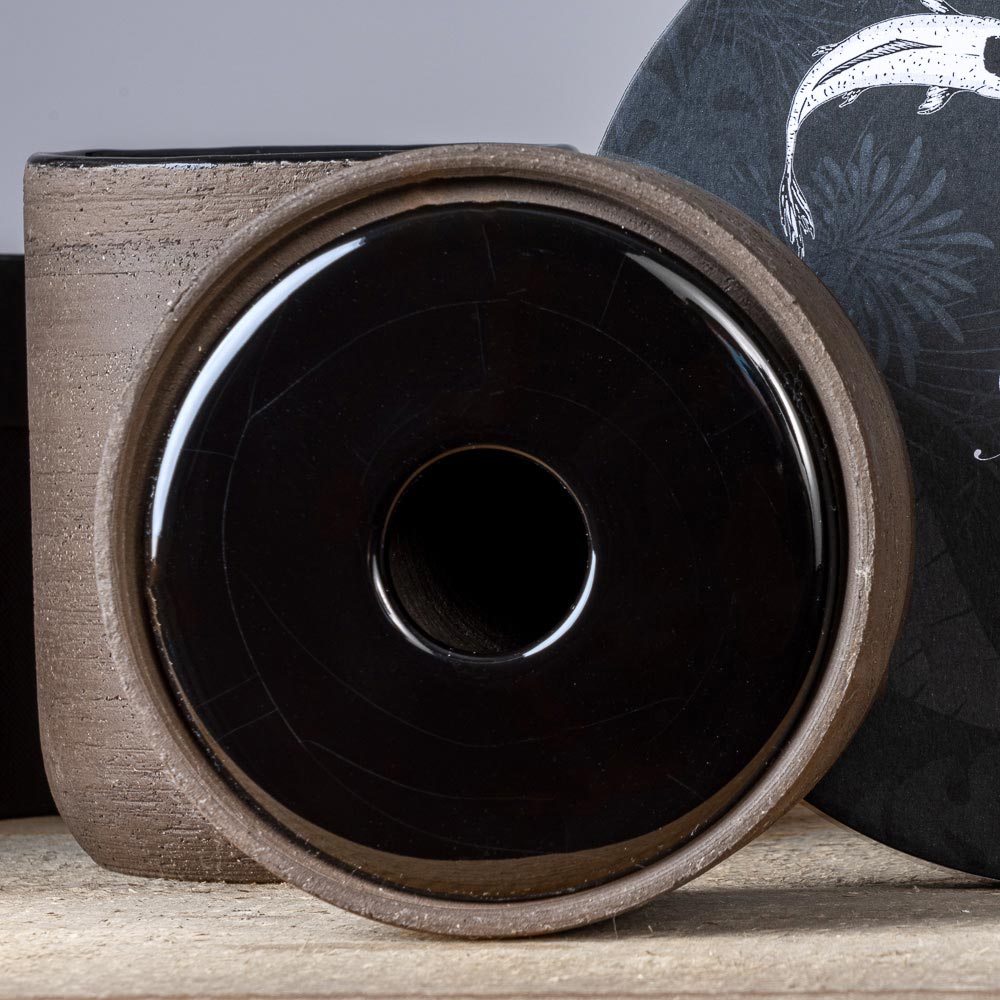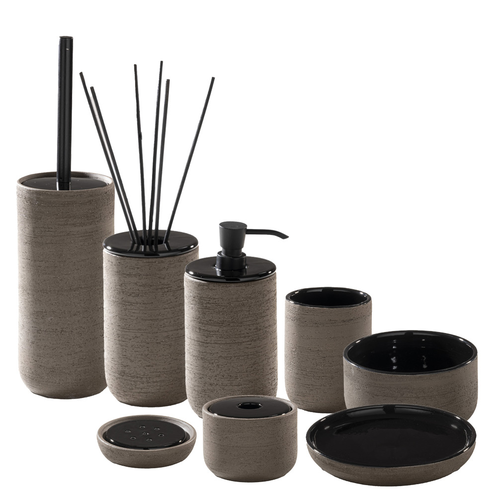 Free- standing bathroom accessories made of fireclay and dark earths handmade in Italy enameled inside with a black finish, the color par excellence of elegance and refinement. Each element of the composition is characterized by particular details such as the neoprene pad on the base of the accessories to guarantee the protection of the support surfaces and the dispenser with pump in matt black metal to ensure optimal dispensing of the soap. The countertop accessories are elegant and fascinating, particularly functional with unique reflections that create exclusive atmospheres.