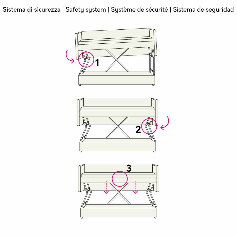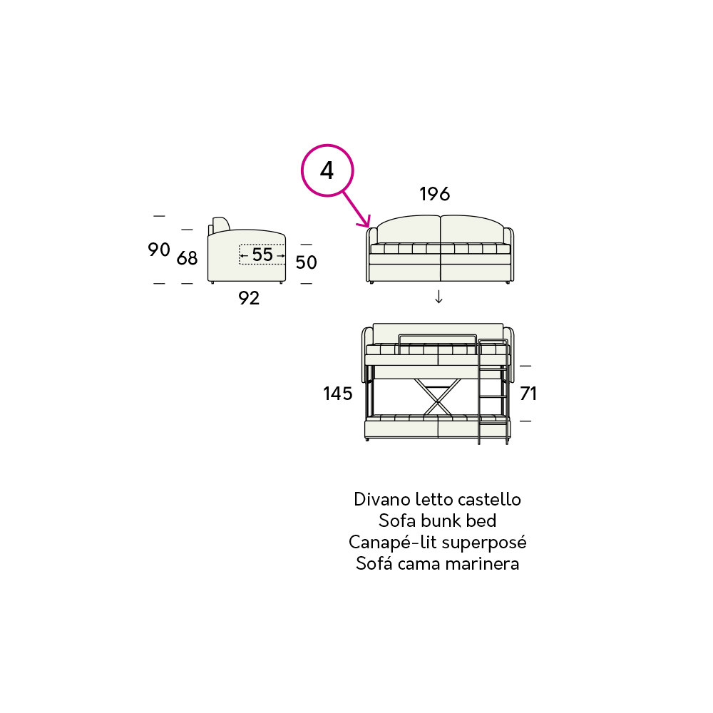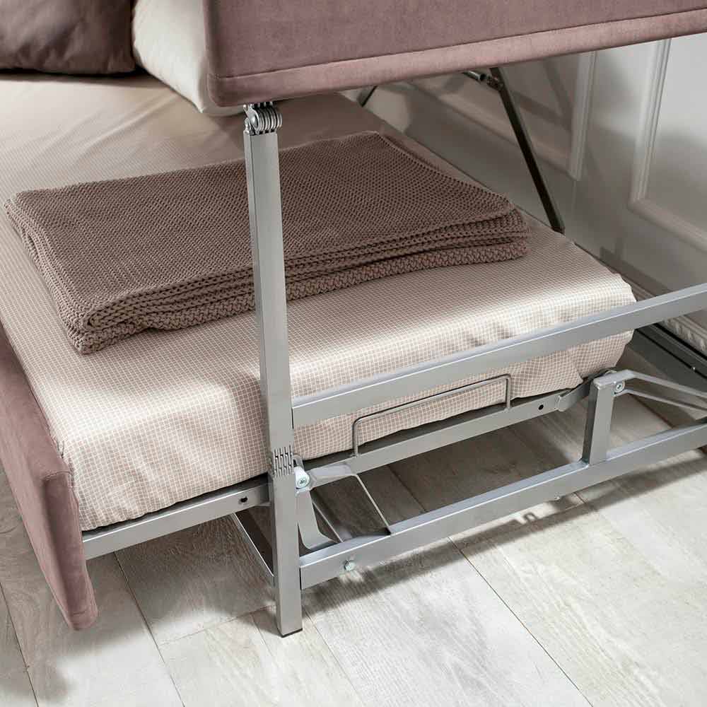 Bunk sofa bed made in Italy with non-deformable polyurethane foam padding and cover in brown fabric (completely removable) with white quilt. It also includes a mechanical network with a steel tube frame that supports the weight of two adults without deforming and 2 non-deformable polyurethane foam mattresses (density 25 kg / m3). A functional idea that does not give up the look, managing to offer a second bed without increasing its size thanks to the practical bunk mechanism . Every detail is studied for maximum comfort and tranquility thanks to the opening system with three safety devices that transform the bed into a sofa and vice versa and to the network that protrudes by 30 cm to facilitate and speed up the preparation of the lower bed. To close it again, it will be sufficient to free the two lateral supports, which will remain blocked until the central stop is also released. The sofa bed is also equipped with a practical ladder and side rail for an even greater guarantee of safety.