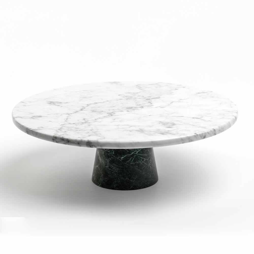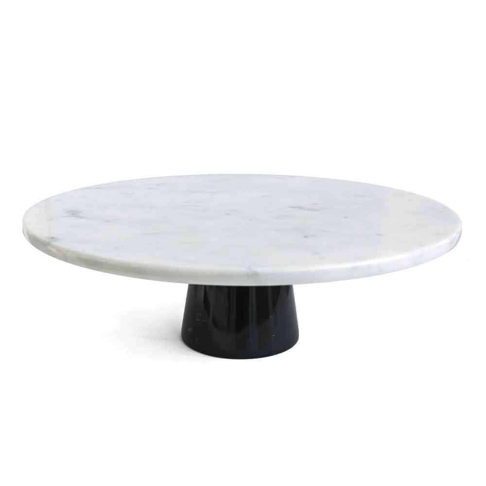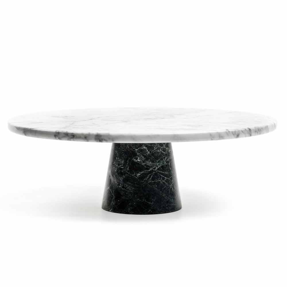 Elegant modern cake stand with white Carrara marble top and black Marquinia marble base. Made of high quality fine marble. It is a unique piece as each block of marble used differs from the others for veins and shades.