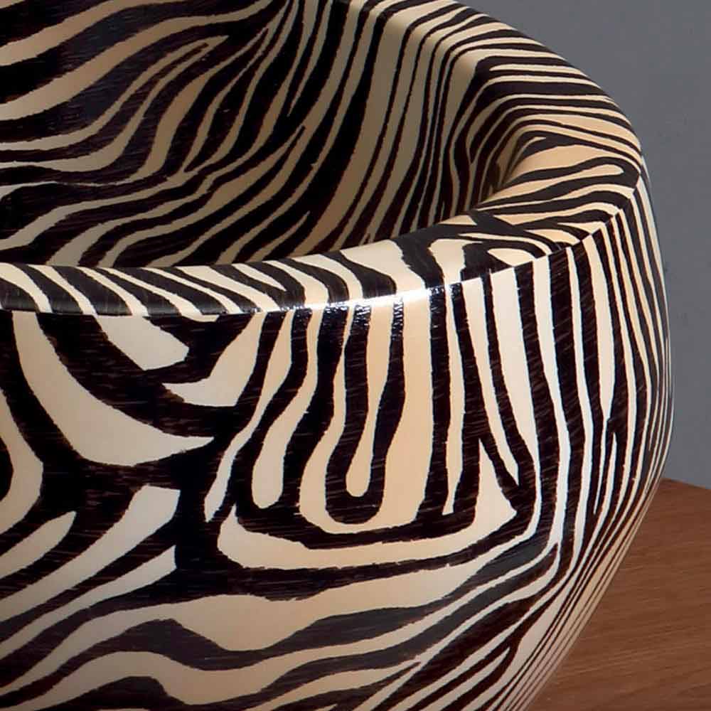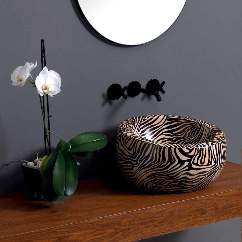 Elisa is a ceramic countertop washbasin with orange zebra finish with light and bold lines.