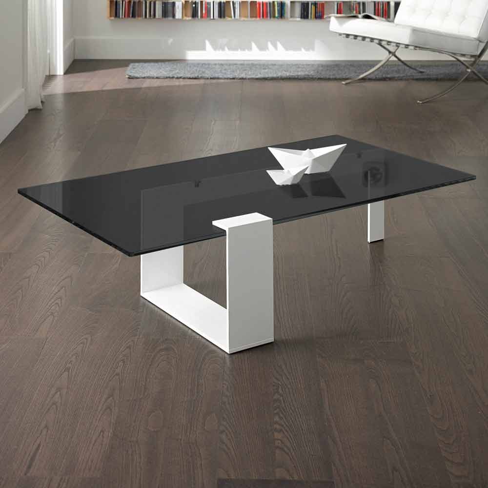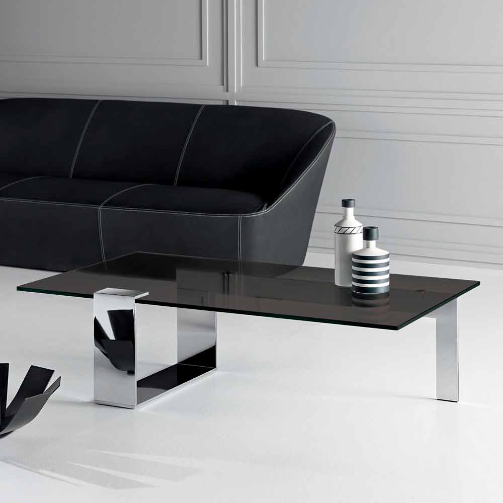 Rectangular modern design coffee table with smoked glass top and metal base, made in Italy.