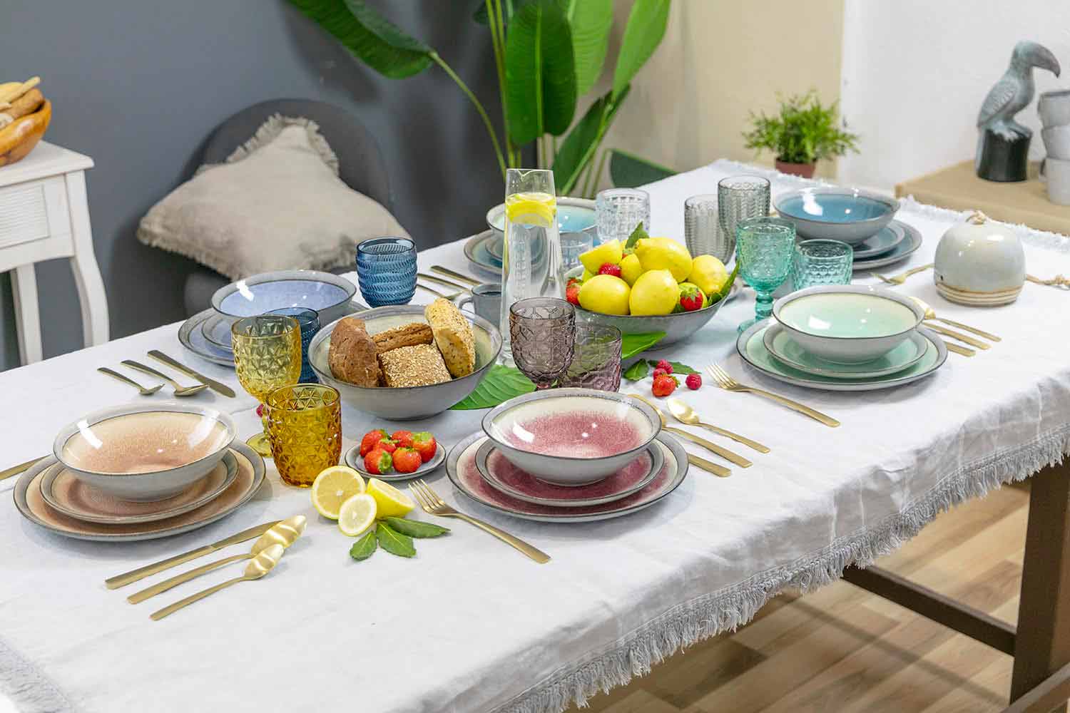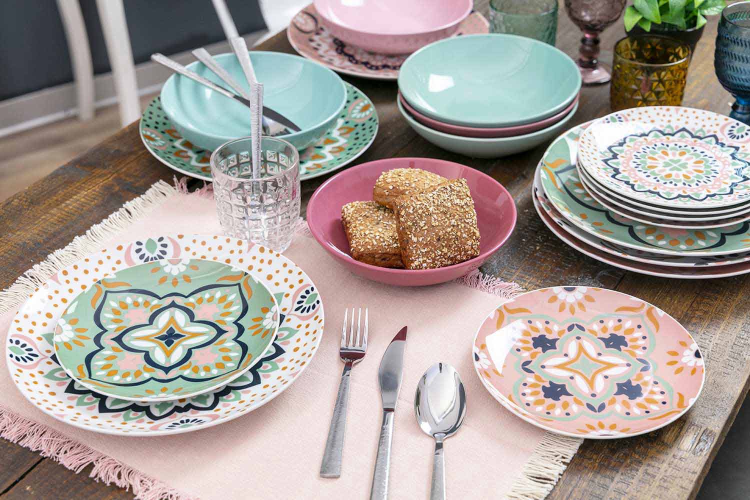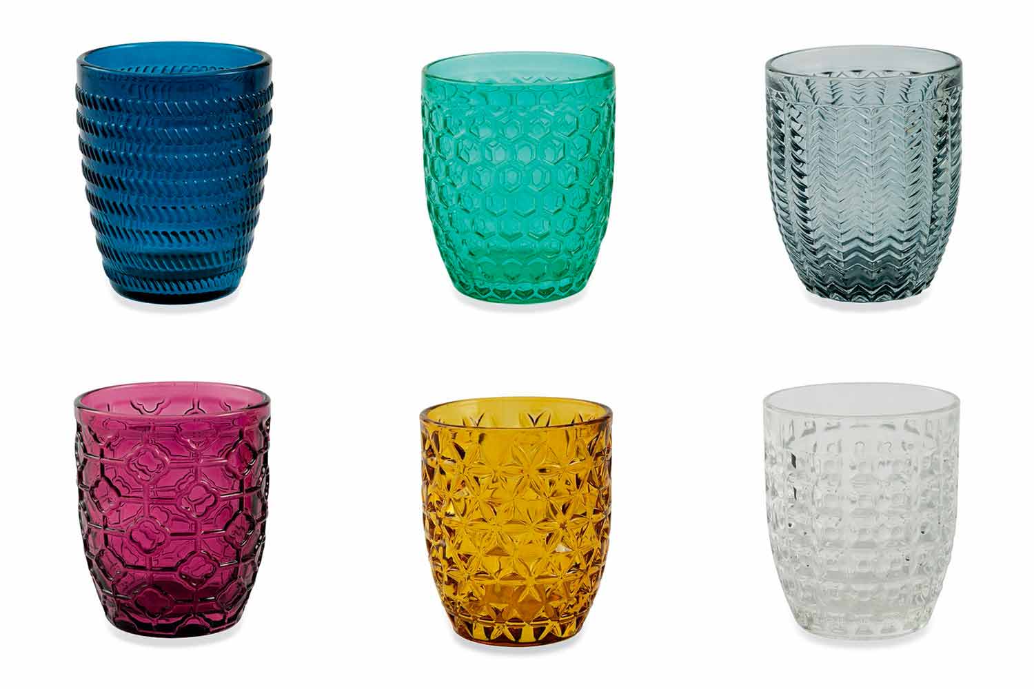 A unique and inimitable line of glasses. Each glass impersonates itself with its own color and decoration , as if it wants to differentiate itself from each other, emphasizing even more the uniqueness of each guest, who participates in conviviality in a different way. A modern and intriguing atmosphere, the intense colors felt enhance the geometric shapes engraved on the surface, resulting on the device as a precious accessory without equal. Sitting at the table thus becomes a unique experience, in a balance of shapes and colors through which the set will seem to come to life.