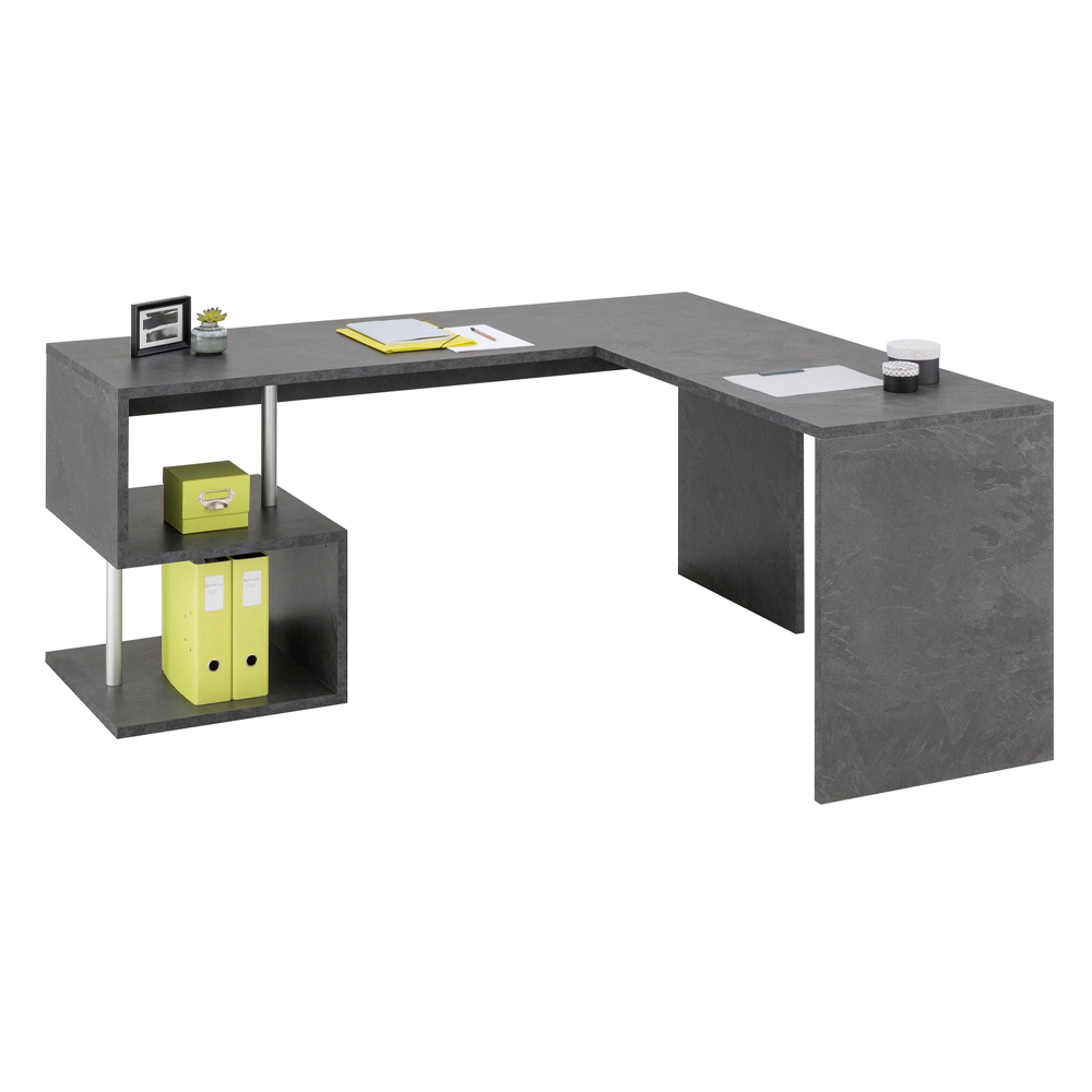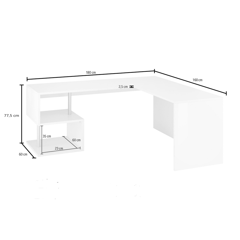 The corner desk is characterized by its modern design with a practical side shelf in the shape of an "S" with 2 open compartments which gives the structure a particular and contemporary look. Can be used as a study or work desk, it is made of sturdy and resistant sustainable melamine wood coated in melamine resin available in two finishes.