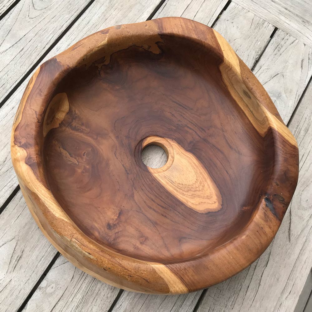 Natural and polished teak in an essential and practical shape. Untreated wood returns the scents and colors of tropical forests. Countertop washbasin in smooth and untreated natural teak.