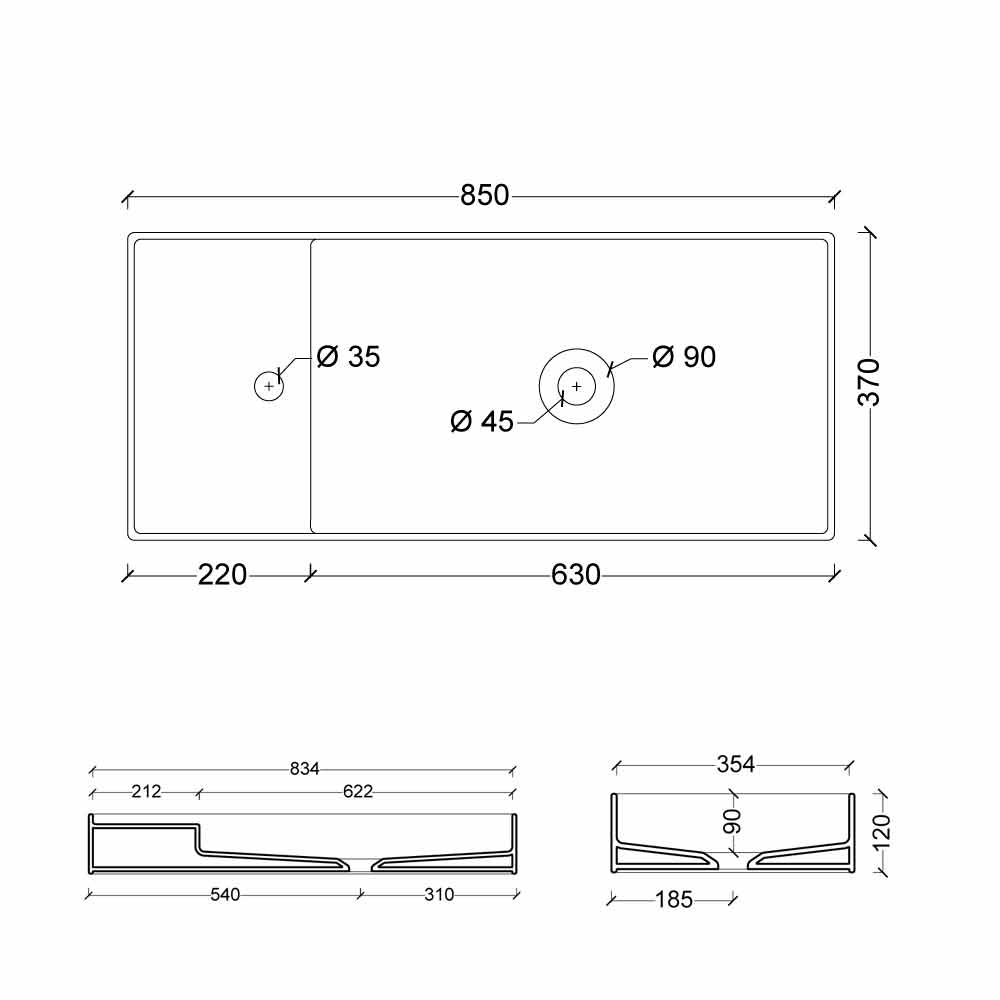 As optional it is possible to have the round brass siphon with chrome finish and it is also possible to have the Hide 85x37 lavado with hole or without tap hole, for more information do not hesitate to contact clienti@viadurni.it.