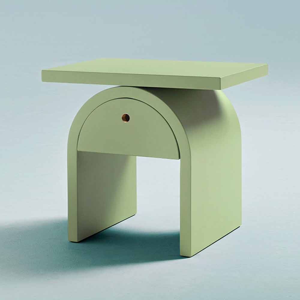 The peculiarity is given by the round arch of the structure which supports a horizontal plane at the point of tangency. These simple geometric elements characterize the furnishing accessory through unconventional lines , with a container hidden under the arch with a flap opening that acts as a drawer.