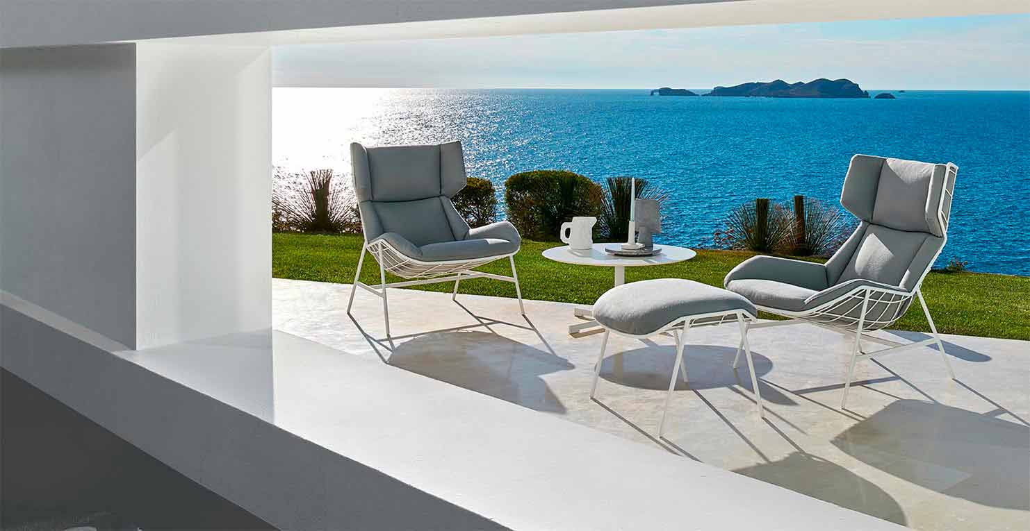Summer Set is an enchanting bergere relax garden armchair, characterized by a supporting structure in powder-coated steel with a choice of white or black colors; seat and back cushion covered in fabric and padded with Dryfeel rubbers.