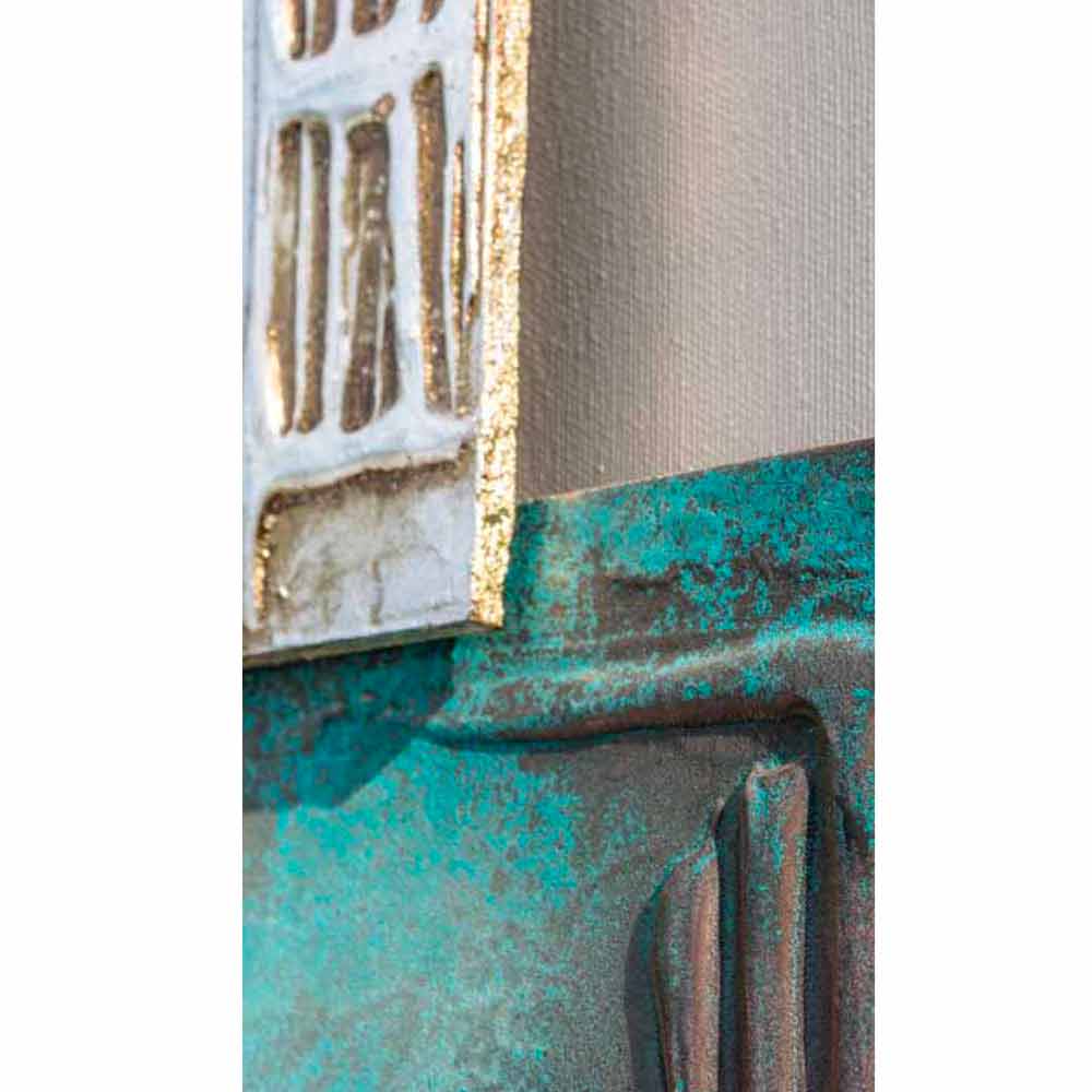 Modern design wall painting. Taupe lacquered canvas with 8 decorative overlapping elements in the finishings: gold, silver, acid etched bronze (rust effect).