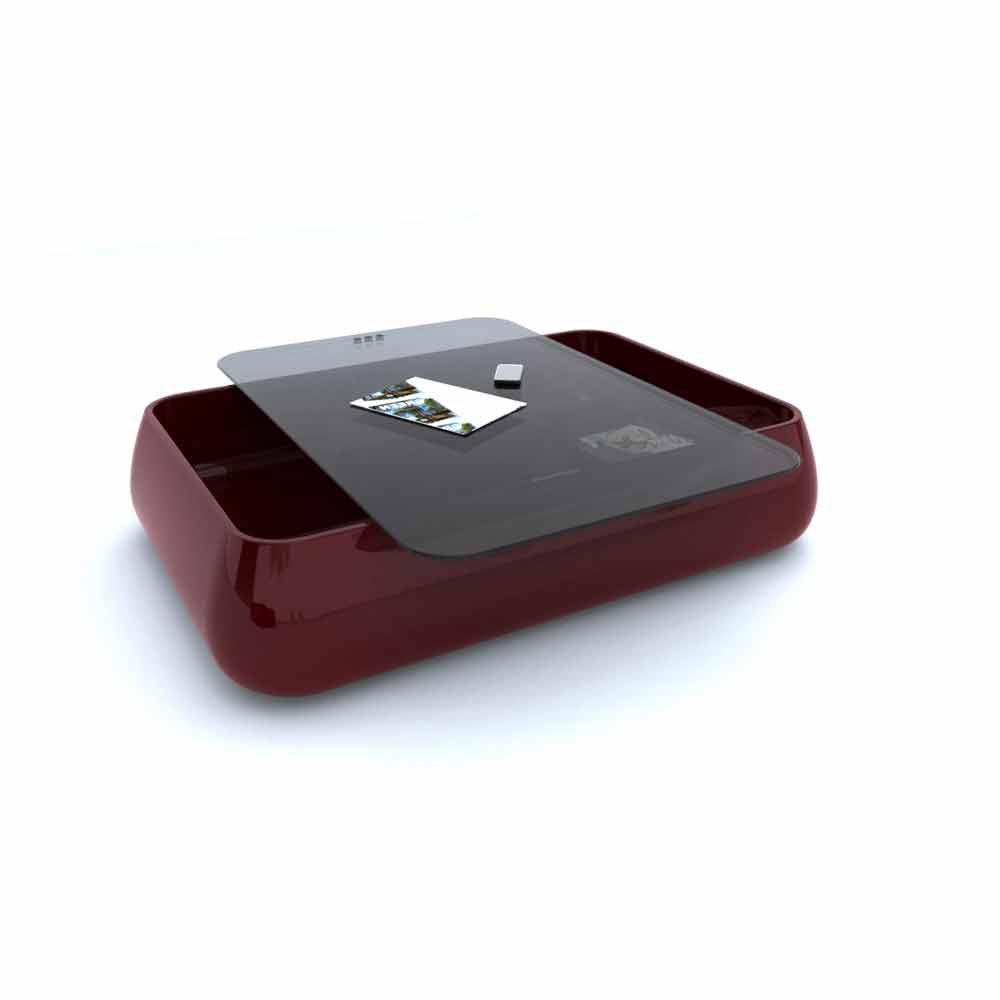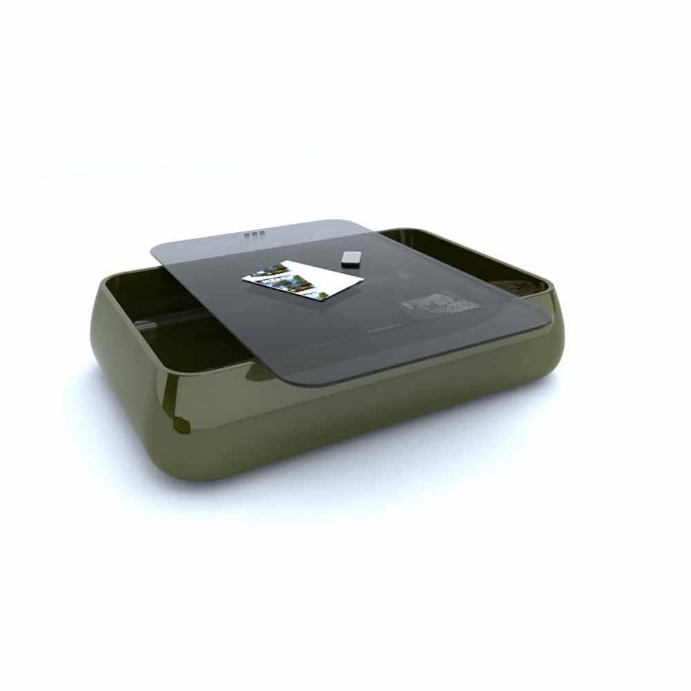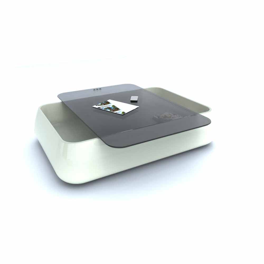Coffee table with rounded and ergonomic shapes. It has a rounded shape. IThe structure and a inner shelf are made of Solid Surface;, while the top is made of a different material, like wood, marble or glass, or even in cork, which can be interlocked.
