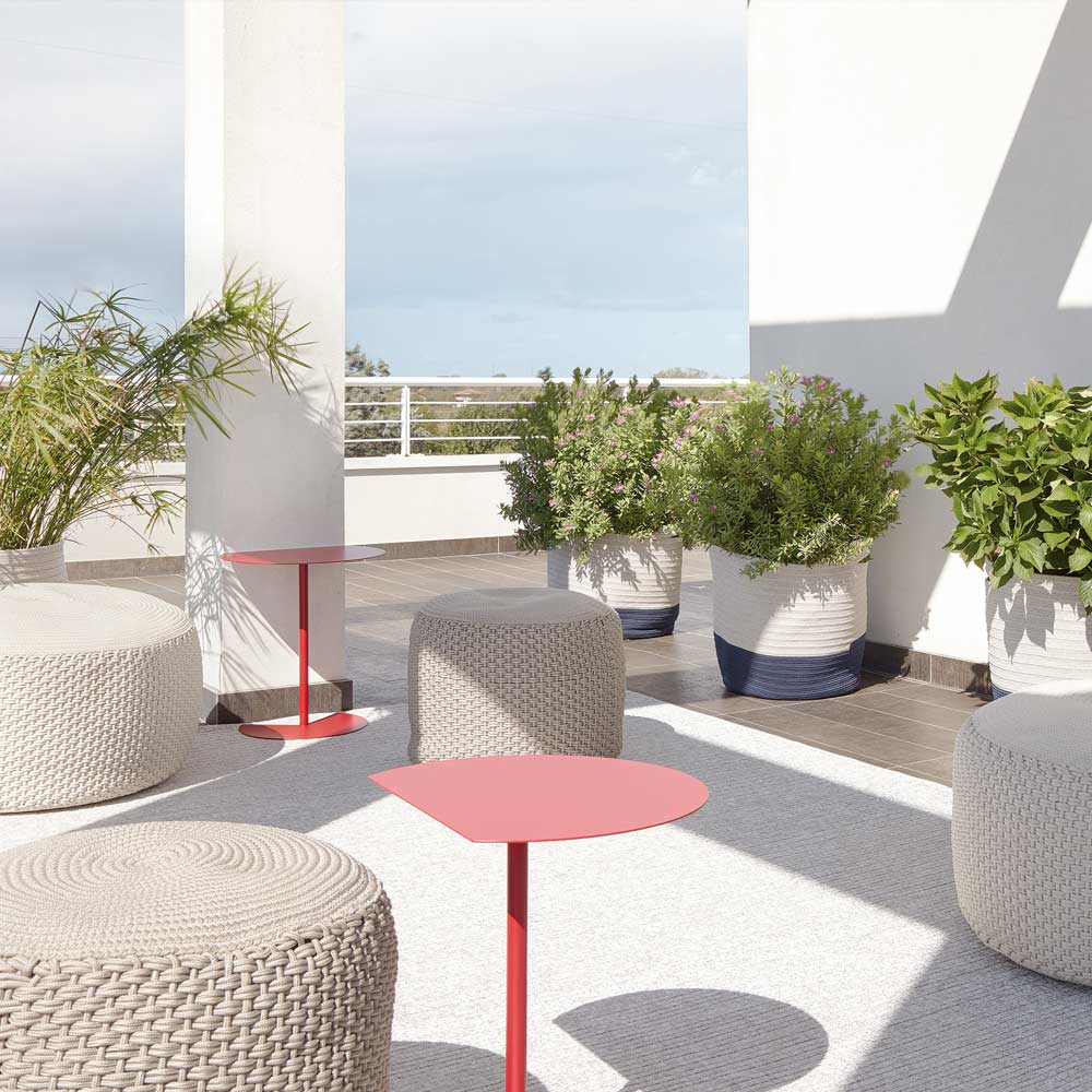 outdoor coffee table is characterized by the support surface that recalls the roundness of the circle broken by a clean cut so that it can be placed attached to a wall, to optimize space, or to be coupled to a similar one, to a highly functional