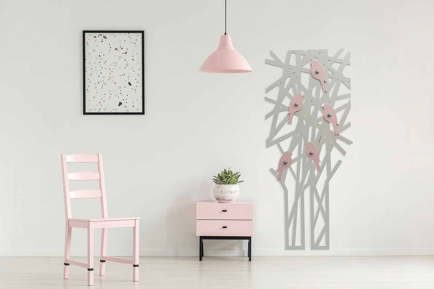 Wall hanger for entrance hall, modern design in the shape of a stylized tree with birds, made in Italy.