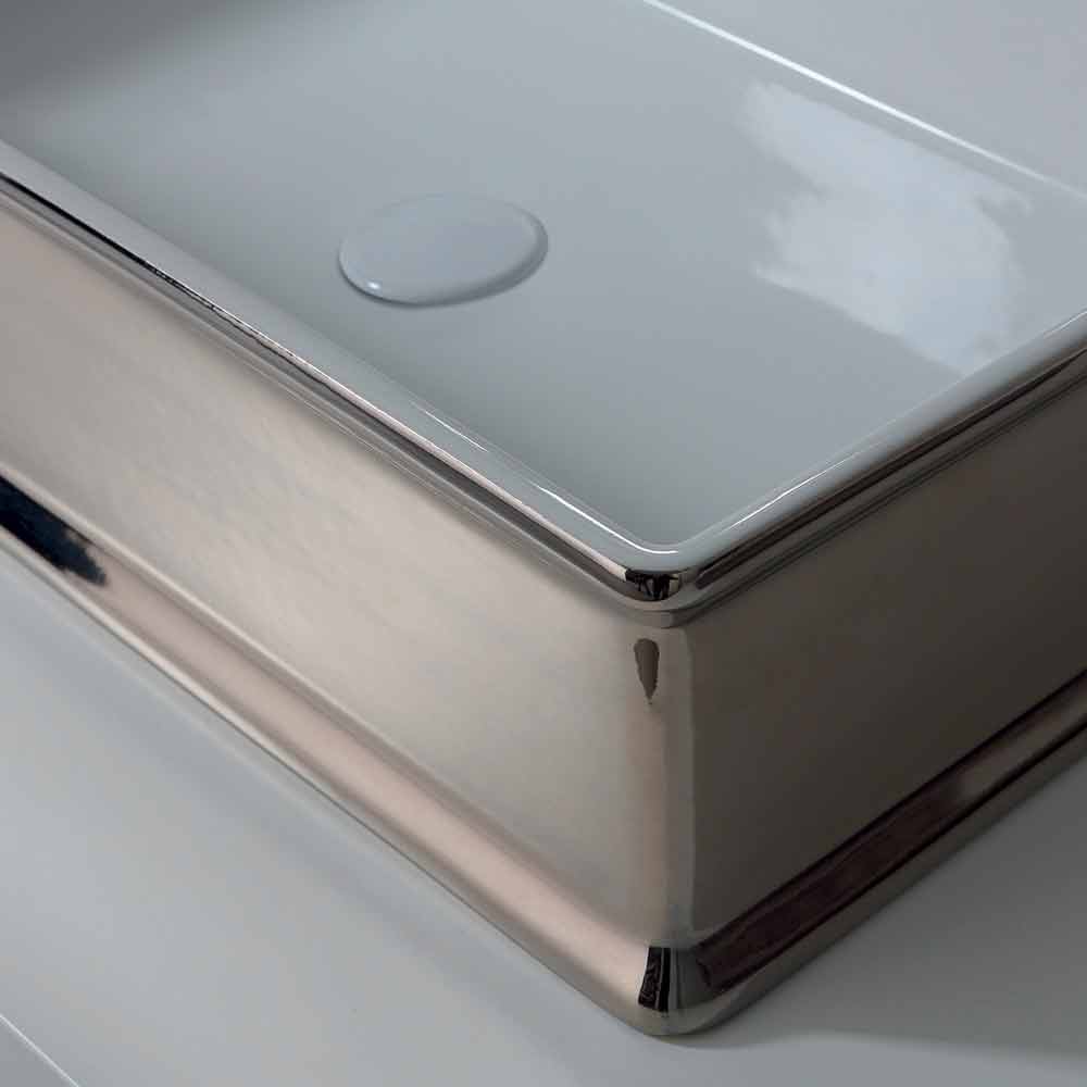 Debora is the countertop washbasin made of white and platinum ceramic which encompasses refinement and elegance without neglecting functionality.