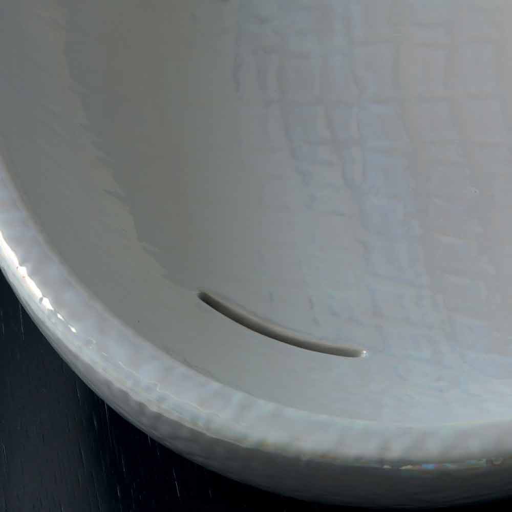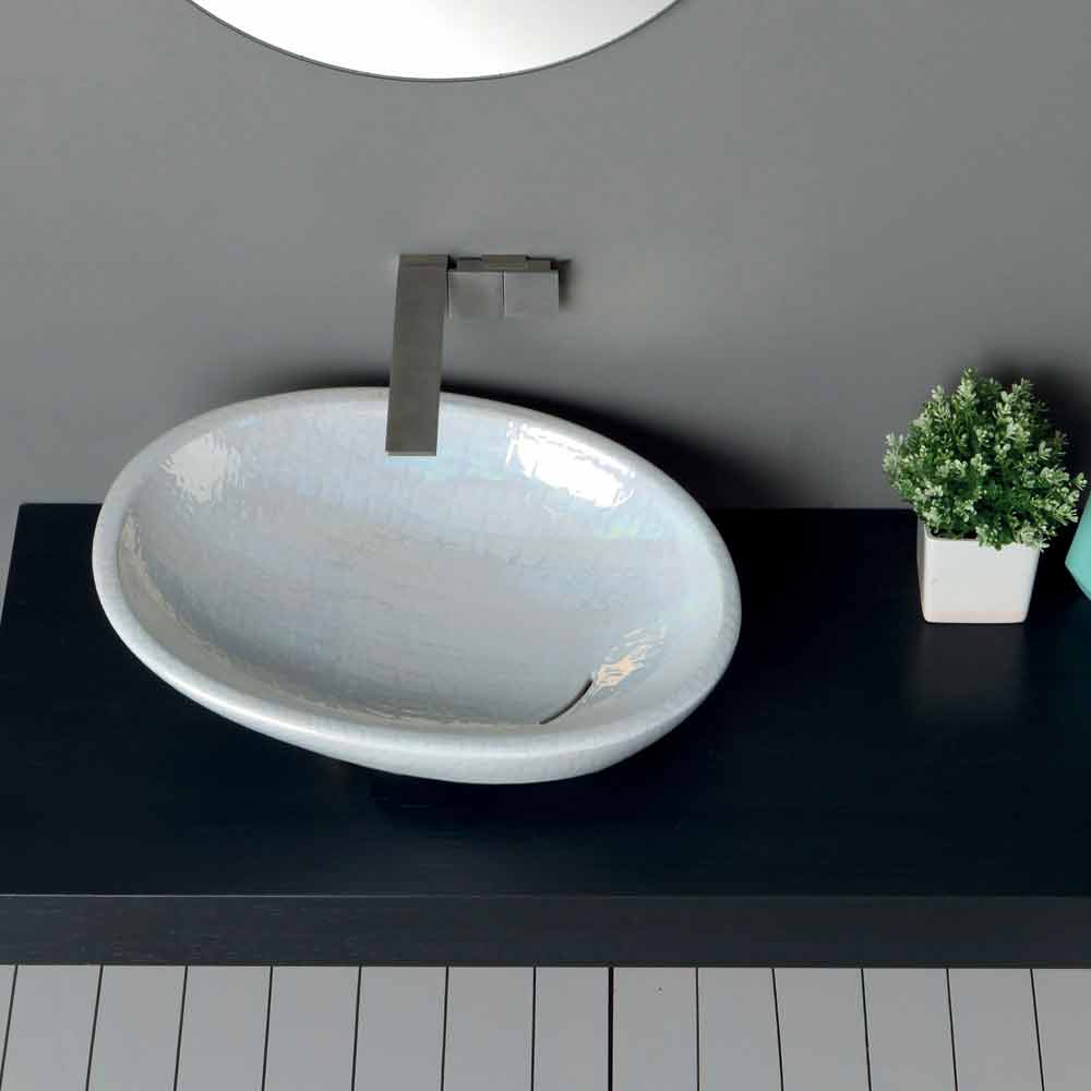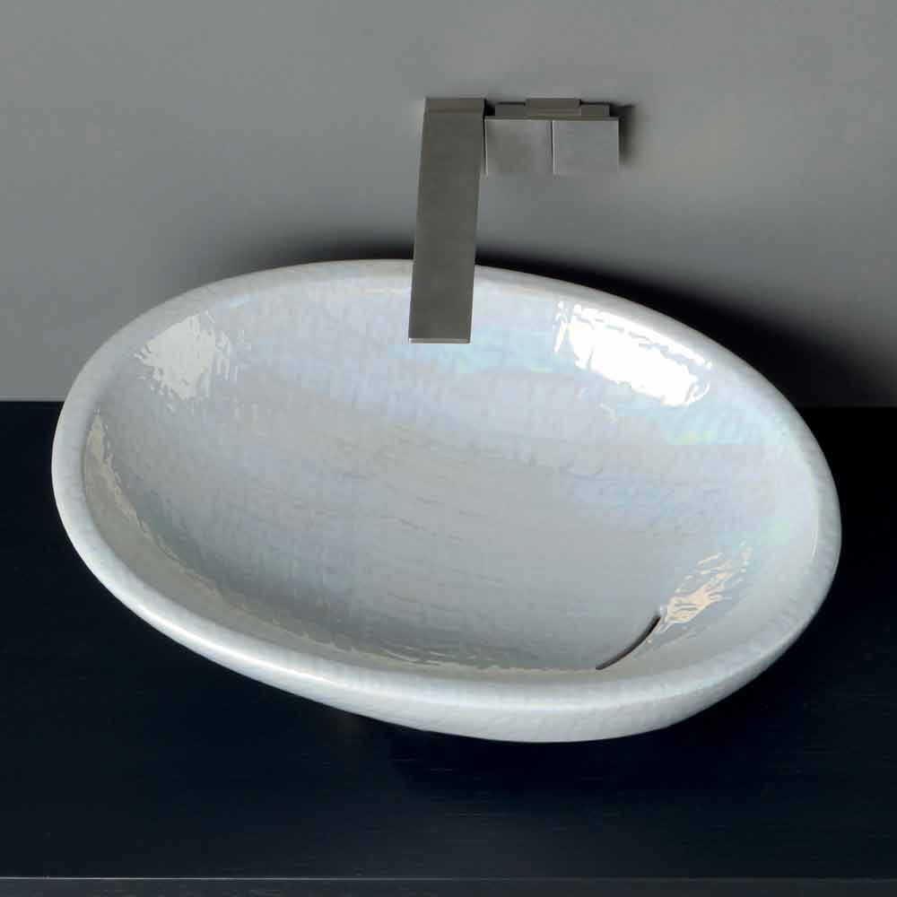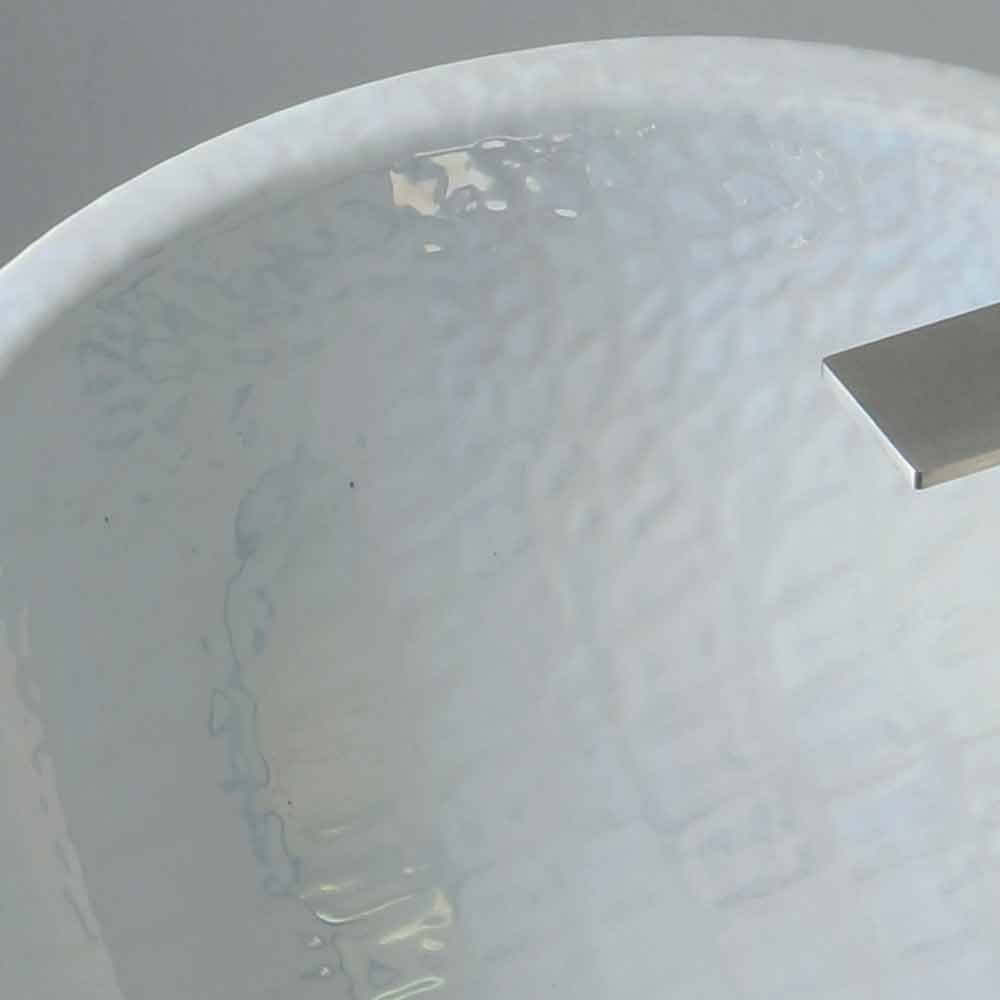 Handmade in Italy in ceramic with a mother-of-pearl finish; inclined with a soft and elongated shape and with a continuous flow of water.