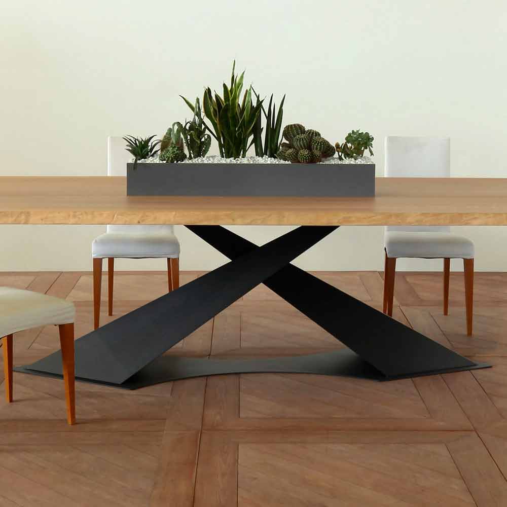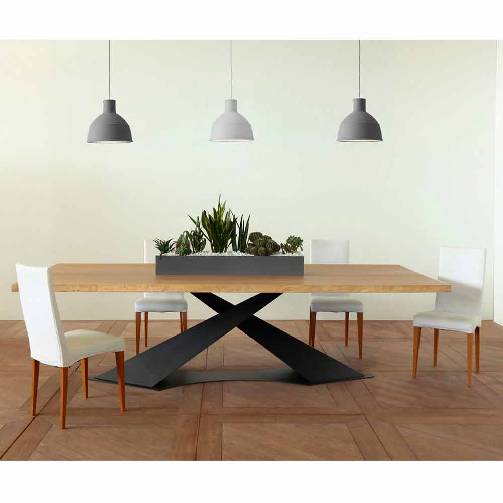 The Elliot table is characterized by a brushed solid oak top with a bark edge, painted with a natural effect and an anti-scratch water-based paint, with the particularity of giving an extraordinary table effect without the risk of deformation and cracking inherent in solid wood and the support central metal, with elements inclined and crossed asymmetrically.