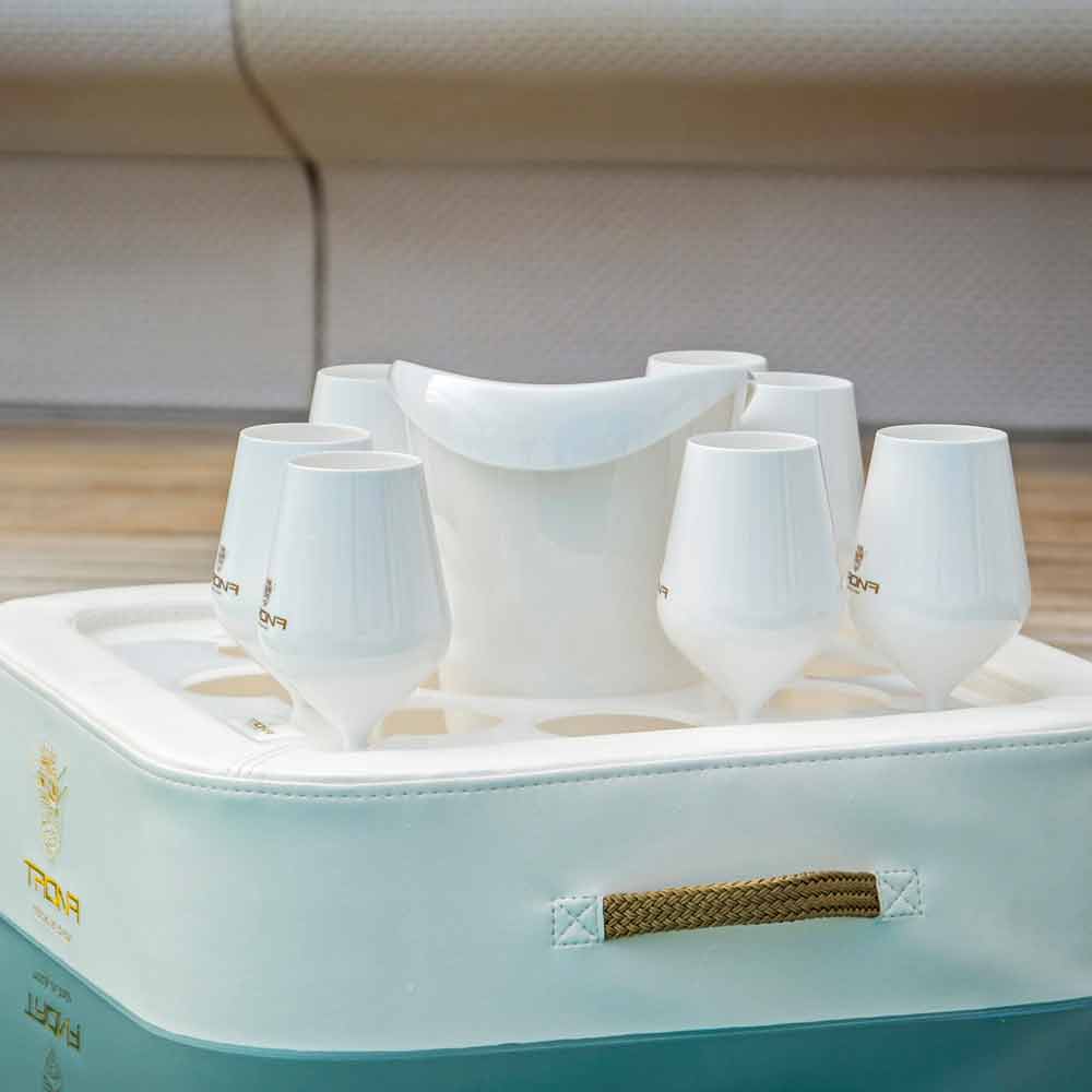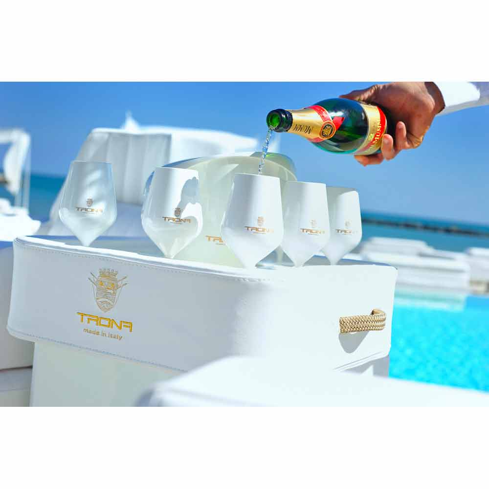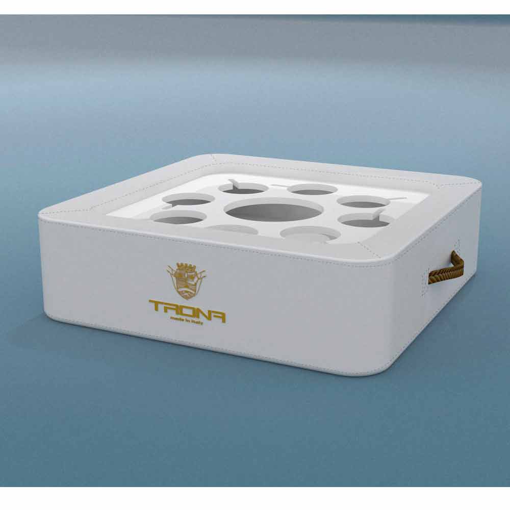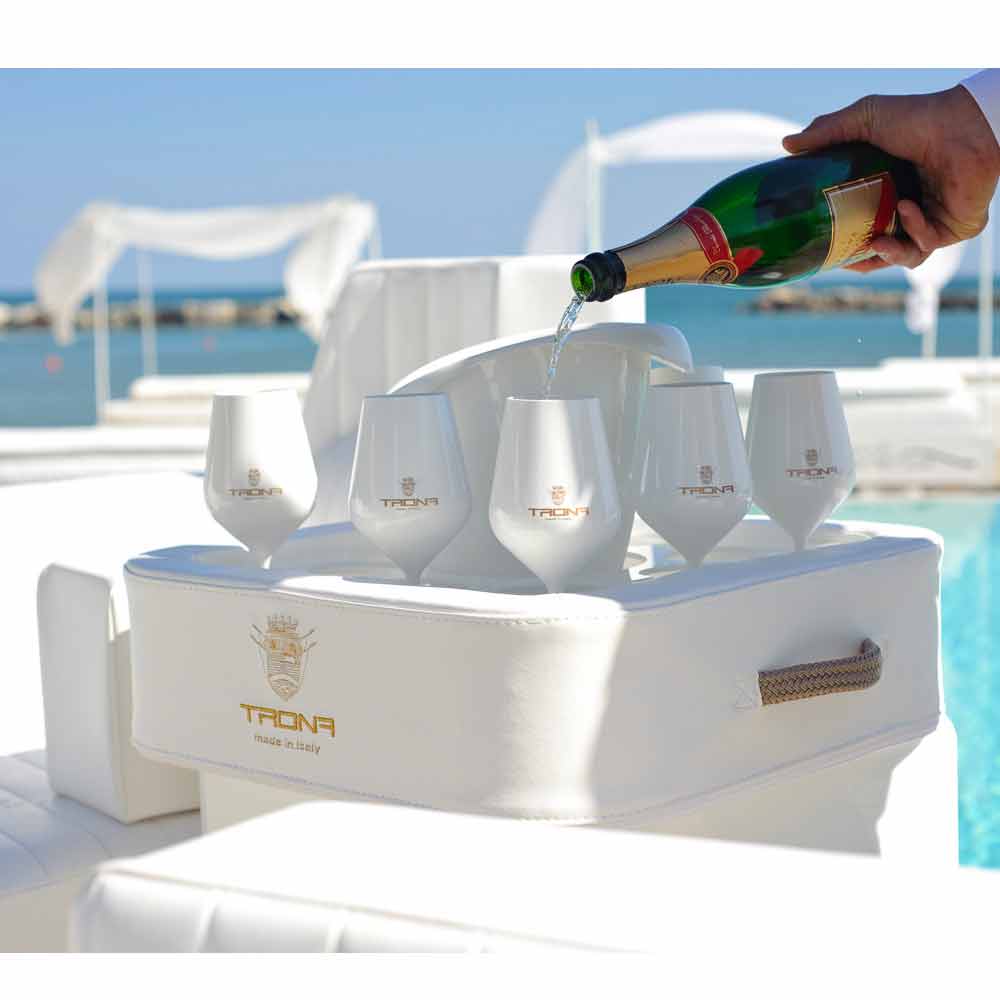 The pool tray Trona has been conceived for pool cocktail parties. The plexiglass plate supports bottle, glasses or the ice cube containters without any overthrow risk. It is provided with a central glass/ice cube container hole and 8 glass holder holes.