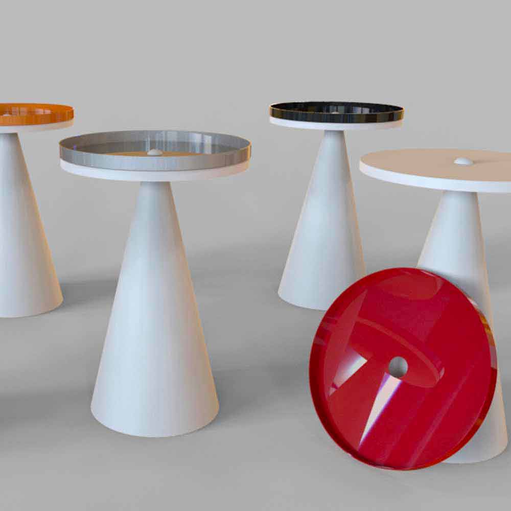 The base, made of matte white Solid Surface;, contrasts with the upper surface in glossy painted sheet metal. The latter can be used separately ensuring at the same time a double support surface.