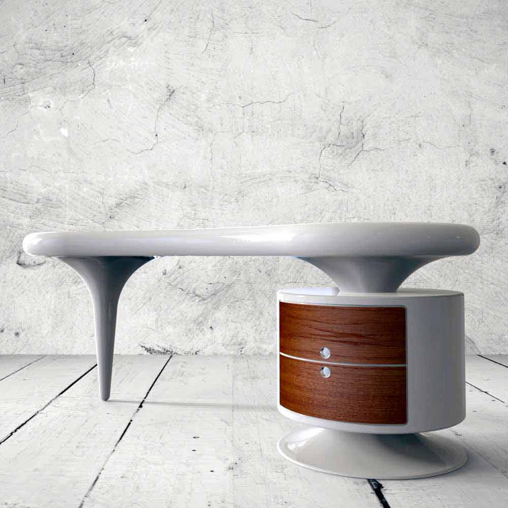 The material contrast given by the modernity of Solid Surface; with the "warmth" of wood and the rounded shapes give a retro touch to the Bean desk.