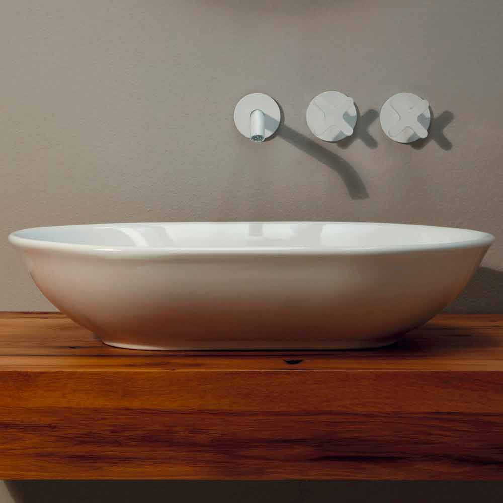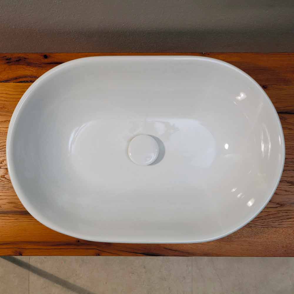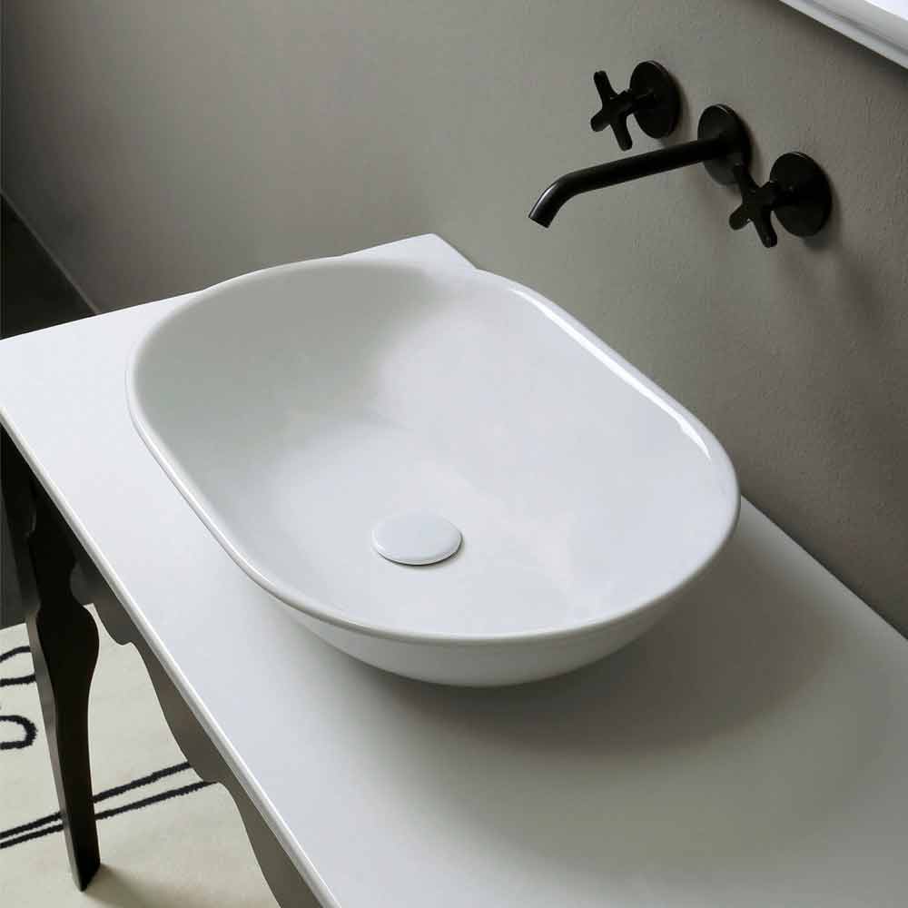 Modern design ceramic washbasin countertop made in Italy Design washbasin reminiscent of the archetype of the toilet bowl. Its oblong shape enhances its function. Suitable for those who want a romantic shape with a slight retro flavor.