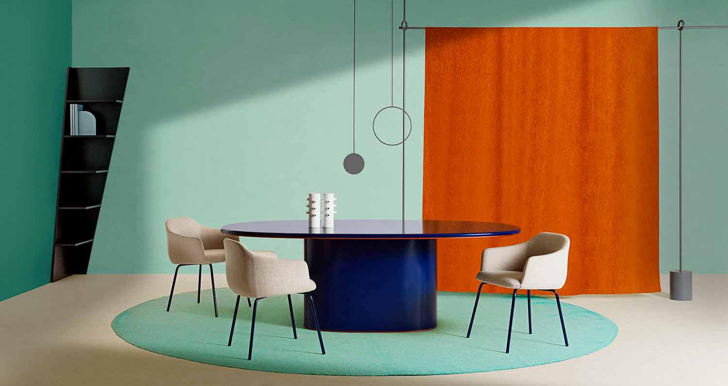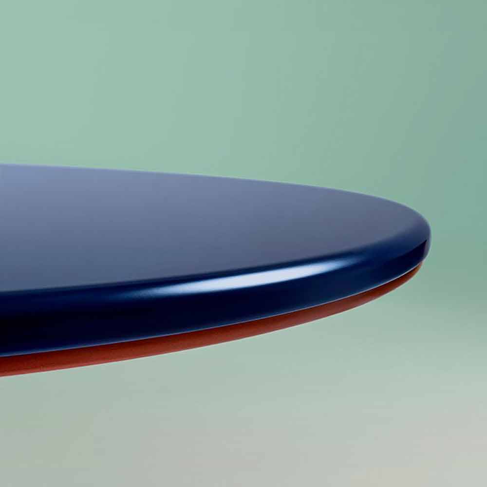 The single leg design and the oval top in lacquered MDF are accompanied by profiles in different finishes that give a luxurious and not at all trivial character.
