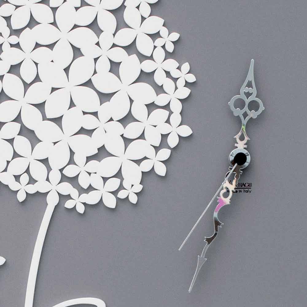 A round clock in stone gray lacquered wood, enriched with floral representations in white plexiglass , to decorate with class and without weighing down the rooms of the house. The hands with an elegant design give a refined and refined style , keeping its modern expression clean and minimal.
