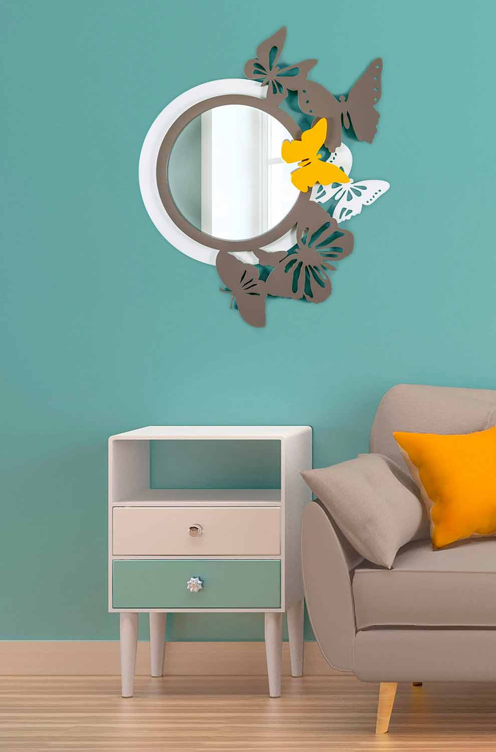 Modern Design Round Mirror in Colored Wood with Butterflies - Beat